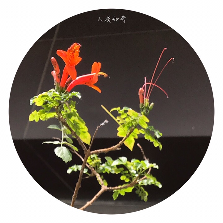 枝带绿褐色,常有上痂状凸起。叶对生,奇数羽状复叶;总叶柄长3-6cm,小叶柄短;小叶多为7枚,卵形至阔椭圆形,长1-2.5cm,先端短尖或钝,基部阔楔形,边缘有不甚规则的锯齿,秃净或于背脉腋内有绵毛。总状花序顶生;萼钟状,5齿裂;花冠漏斗状,略弯曲,橙红色至鲜红色,有深红色的纵纹,长约4cm,上唇凹入;雄蕊突出。蒴果线形,长2.5-5cm,略扁。花期春季和秋季。在云南省西双版纳可全年开花,北方盆栽温度适宜时,花期为8-11月;蒴果扁线形,多不结实。