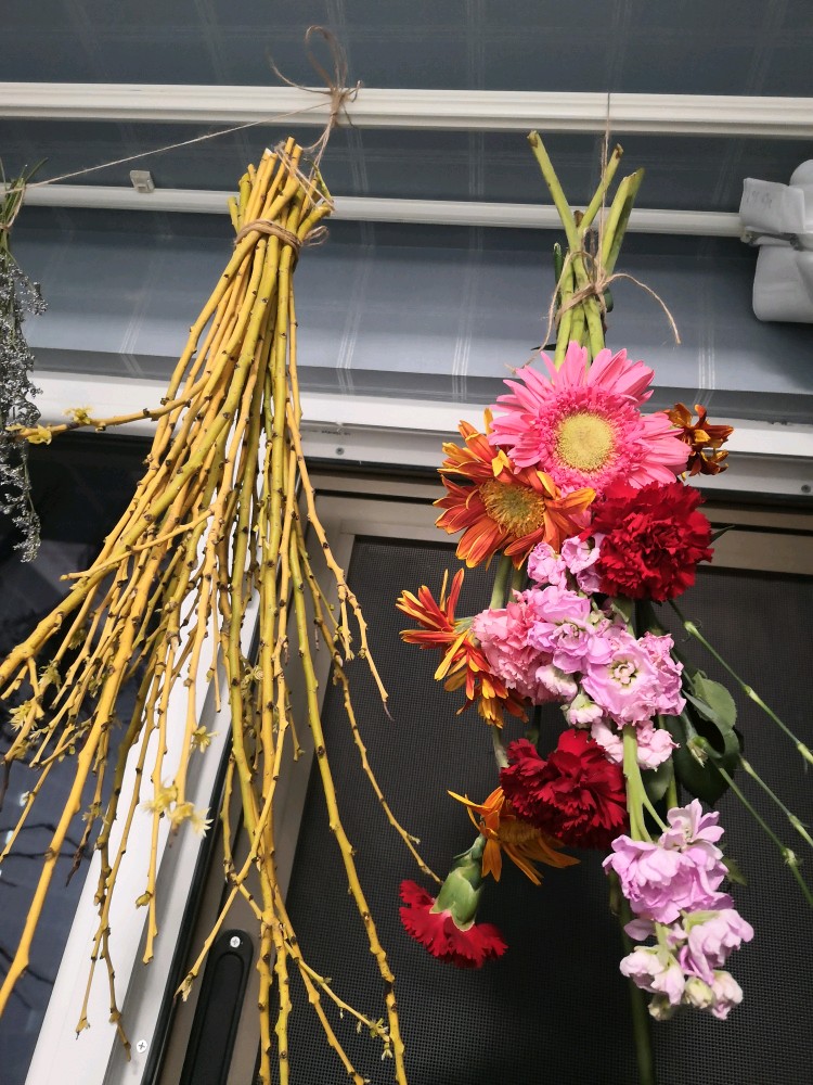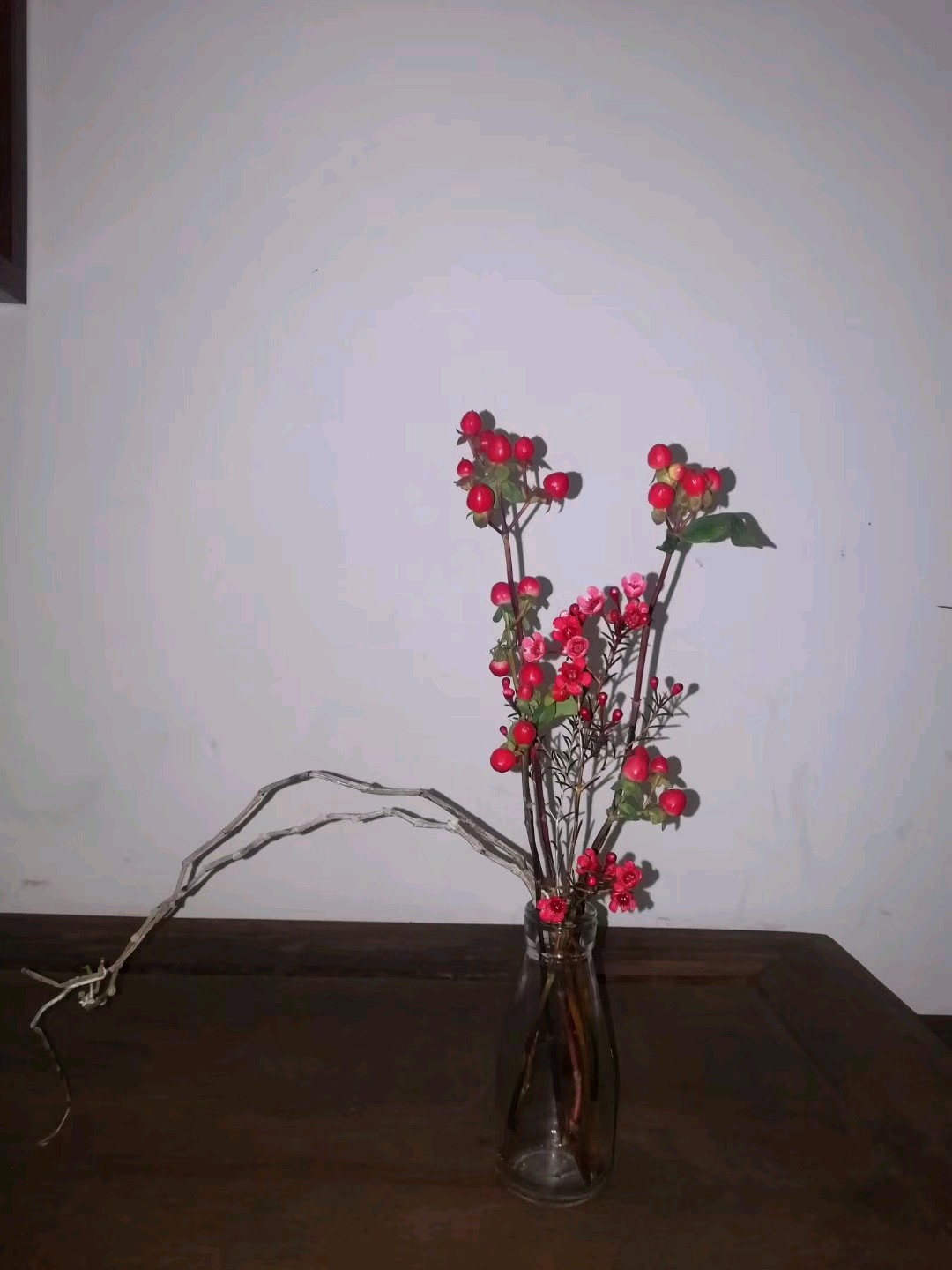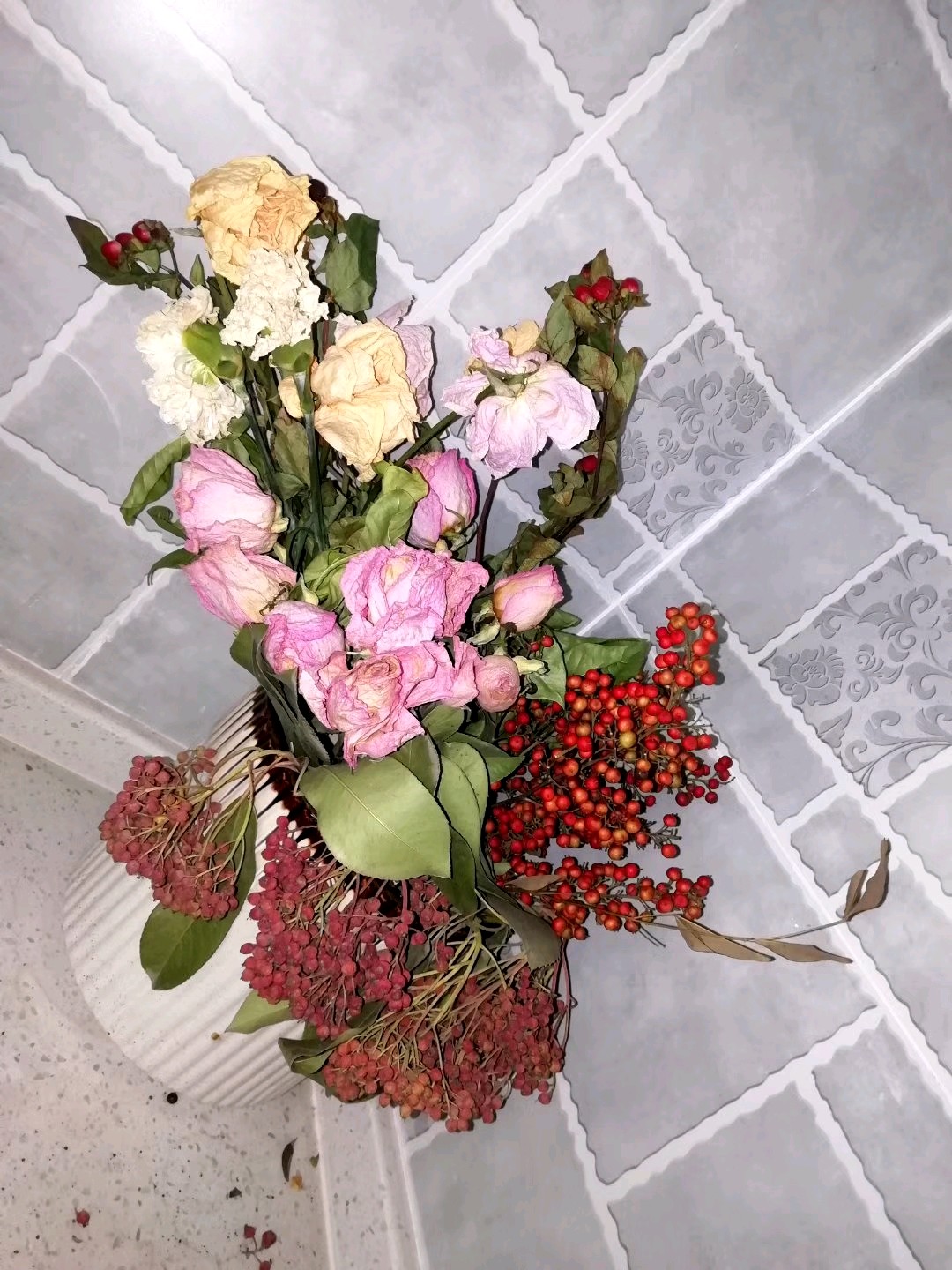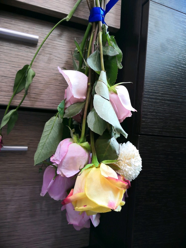 2.2018年的冬天,朋友送我的花束,插在瓶子放了几天,我要出差没人管护,索性就花头交替,吊在办公桌旁边。因为地暖温度高,晒的还不错。