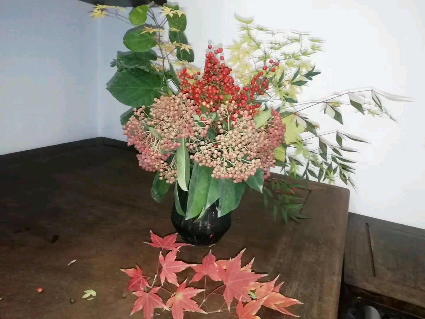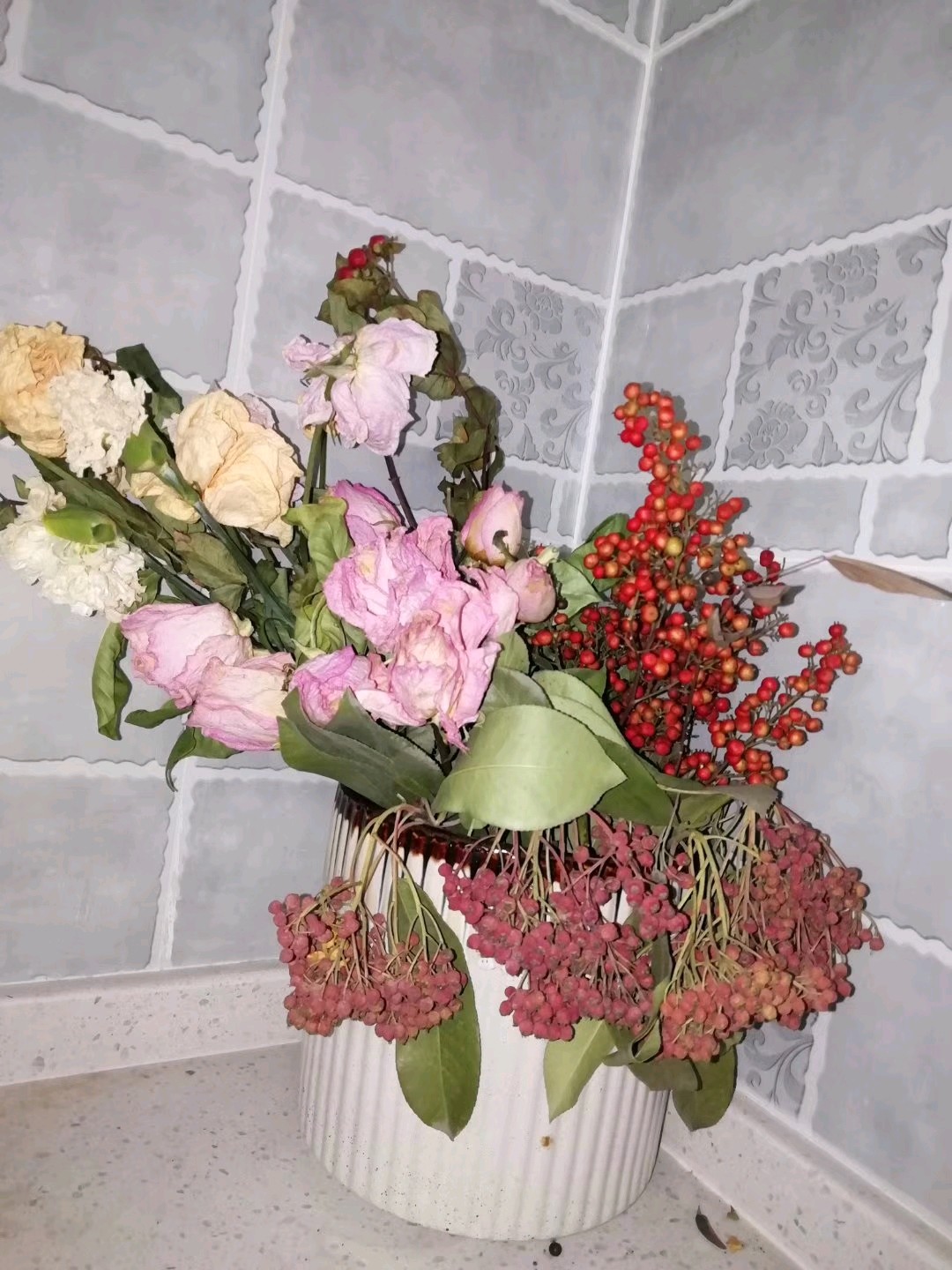 5.2018年底,我在花店订的许多周期花都被我晒干了。搭配上一些植物的果实、树叶,放在花盆里有种田园!