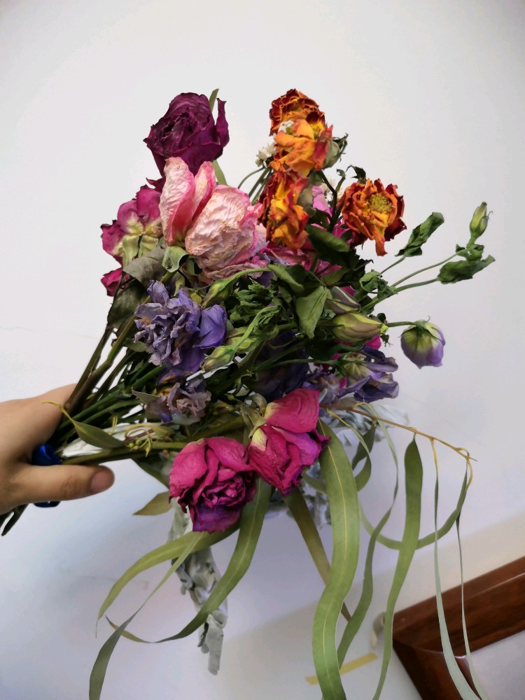 3.2018年同事结完婚布置婚礼现场的花,被我们带走了一些。香槟色和白色洋桔梗,晒干了特别美,还有尤加利叶子!