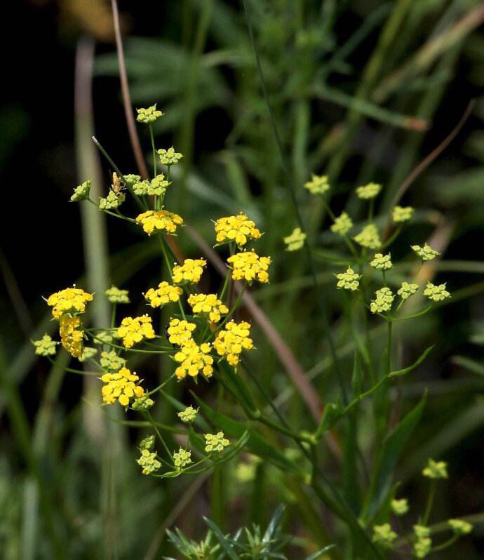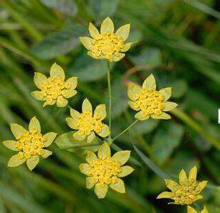 北柴胡(学名:Bupleurum chinense DC.)是伞形科,柴胡属多年生草本植物,高可达85厘米。主根坚硬较粗大,棕褐色,茎表面有细纵槽纹,实心,基生叶倒披针形或狭椭圆形,顶端渐尖,基部收缩成柄,叶表面鲜绿色,背面淡绿色,常有白霜;茎顶部叶同形,复伞形花序,花序梗细,水平伸出,形成疏松的圆锥状;总苞片甚小,狭披针形,花瓣鲜黄色,上部向内折,中肋隆起,花柱基深黄色,果广椭圆形,棕色,9月开花,10月结果。