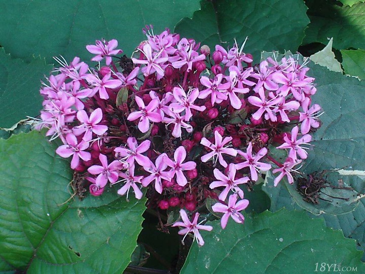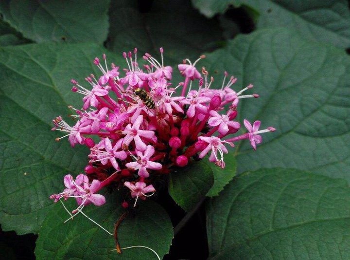 臭牡丹(学名:Clerodendrum bungei Steud.)是马鞭草科,大青属灌木,高可达2米,植株有臭味;花序轴、叶柄密被脱落性的柔毛;小枝近圆形,叶片纸质,宽卵形或卵形,边缘具粗或细锯齿,侧脉表面散生短柔毛,伞房状聚伞花序顶生,苞片叶状,披针形或卵状披针形,小苞片披针形,花萼钟状,萼齿三角形或狭三角形,花冠淡红色、红色或紫红色,裂片倒卵形,花柱短于、核果近球形,5-11月开花结果。