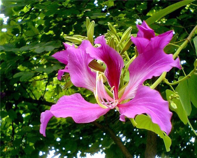 红花羊蹄甲(学名:Bauhinia blakeana Dunn):常绿乔木,树高6-10米。叶革质,圆形或阔心形,长10-13厘米,宽略超过长,顶端二裂,状如羊蹄,裂片约为全长的1/3,裂片端圆钝。 总状花序或有时分枝而呈圆锥花序状;红色或红紫色;花大如掌,10-12厘米;花瓣5,其中4瓣分列两侧,两两相对,而另一瓣则翘首于上方,形如兰花状;花香,有近似兰花的清香,故又被称为“兰花树”。花期十一月至翌年四月。花大如掌,略带芳香,五片花瓣均匀地轮生排列,红色或粉红色,十分美观。