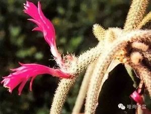 又名金钮。变态茎细细长长,酷似老鼠的尾巴,十分奇特。匍匐,多分枝,长可达2米,幼时亮绿色,后变灰绿色。具浅棱10-14,辐射刺10-20,新刺红色,后变黄至褐色。粉红色的花朵昼开夜闭,非常美丽,也相当有趣。