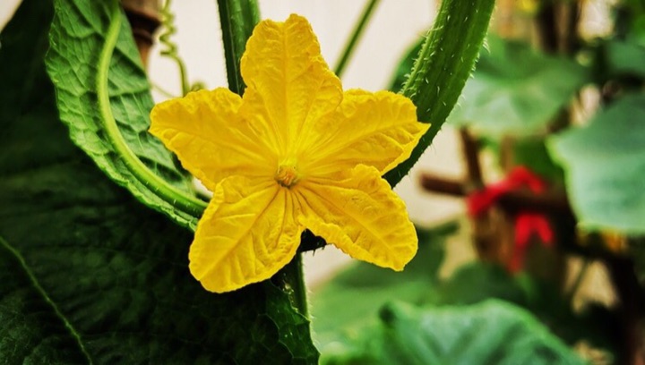黄瓜花(学名:Cucumis sativus L.)葫芦科一年生蔓生或攀援草本植物。茎、枝伸长,有棱沟,被白色的糙硬毛。卷须细。叶柄稍粗糙,有糙硬毛;叶片宽卵状心形,膜质,裂片三角形,有齿。雌雄同株。雄花:常数朵在叶腋簇生;花梗纤细,被微柔毛;花冠黄白色,花冠裂片长圆状披针形。雌花:单生或稀簇生;花梗粗壮,被柔毛;子房粗糙。果实长圆形或圆柱形,熟时黄绿色,表面粗糙。种子小,狭卵形,白色,无边缘,两端近急尖。花果期夏季。