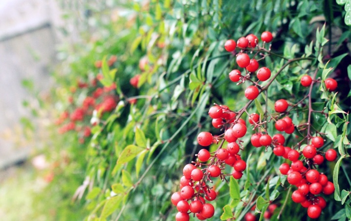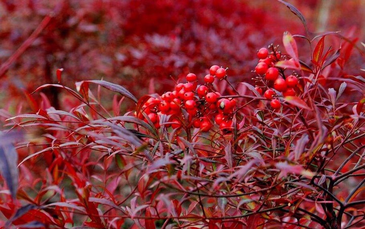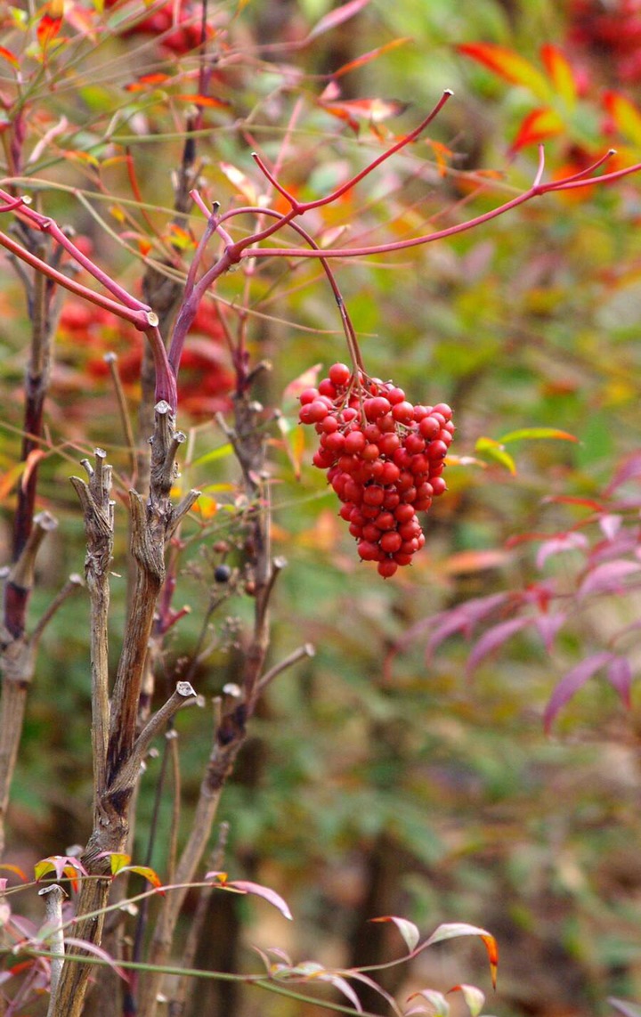 南天竹,别名:南天竺,红杷子,天烛子,红枸子,钻石黄,天竹,兰竹;拉丁文名:Nandina domestica.属毛茛目、小檗科下植物,是我国南方常见的木本花卉种类。由于其植株优美,果实鲜艳,对环境的适应性强,常常出现在园林应用中。常见栽培变种有:玉果南天竹,浆果成熟时为白色;绵丝南天竹,叶色细如丝;紫果南天竹,果实成熟时呈淡紫色;圆叶南天竹,叶圆形,且有光泽。因其形态优越清雅,也常被用以制作盆景或盆栽来装饰窗台、门厅、会场等。