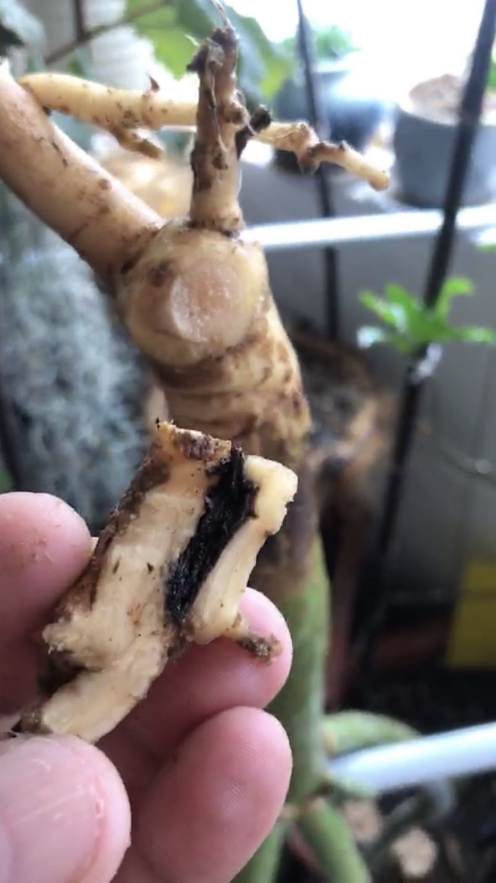 :谢谢已经确定了 是黑腐病 已经处理了 没舍得截肢 只是把坏的部分剔除 整颗的弄出来 晾几天 伤口喷洒的多菌灵 希望能有好转