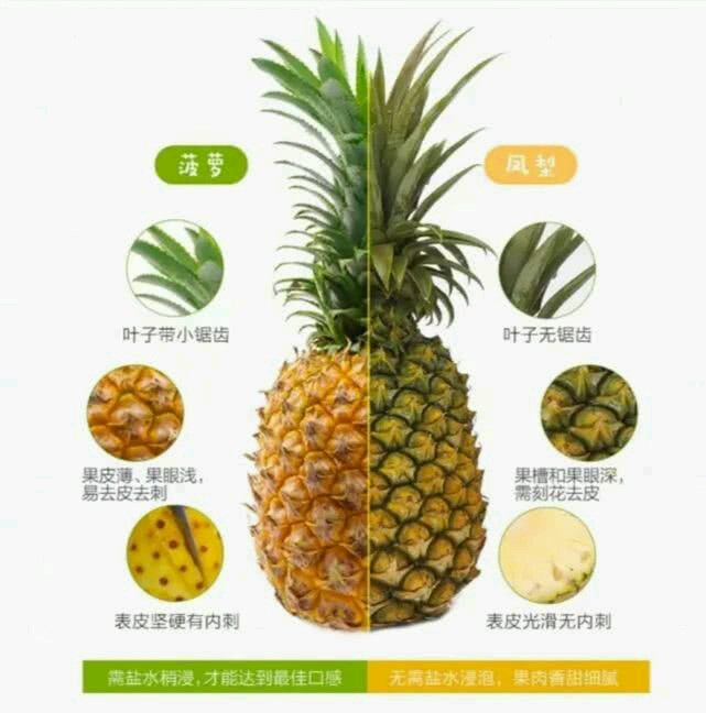 很多人疑问为啥菠萝有很多黑色槽壑,而凤梨没有呢? 这是由于凤梨在选育的过程中出现了比较严重的果实退化,也就去掉了那些槽沟中的黑毛,在有些地方把凤梨称之为“无眼菠萝”~