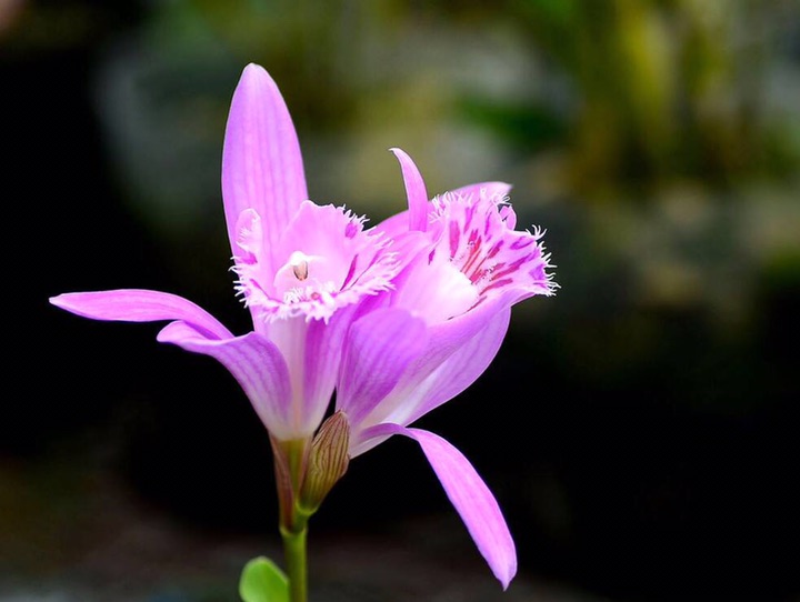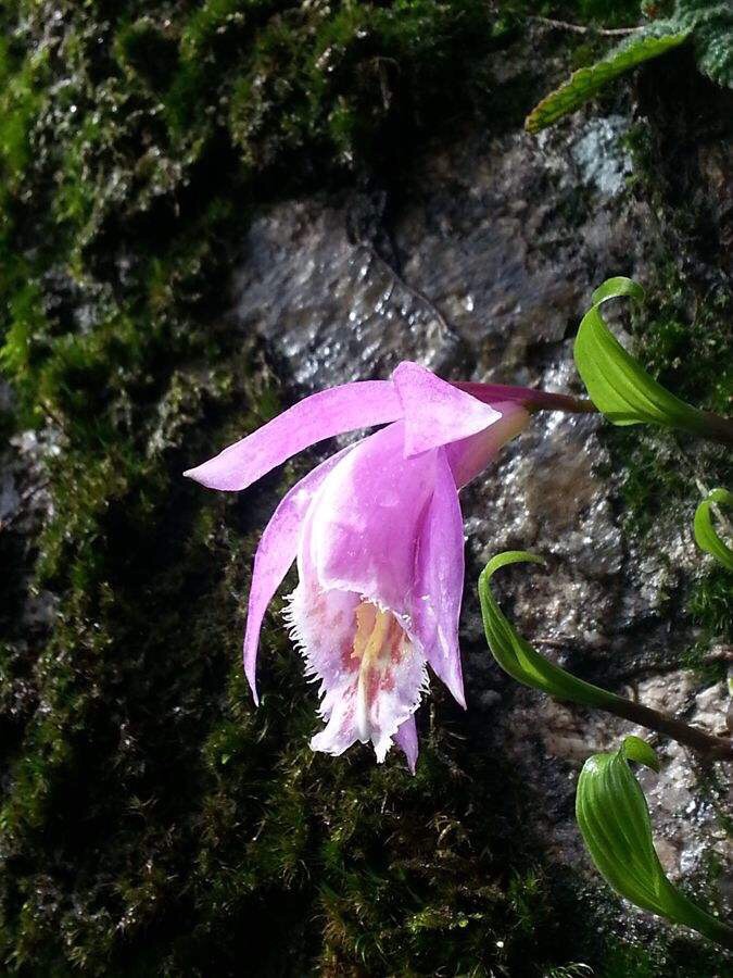 美丽独蒜兰(学名:Pleione pleionoides (Kraenzl. ex Diels.) Braem et H. Mohr.):地生或半附生草本。假鳞茎圆锥形,表面粗糙,顶端具1枚叶。叶在花期尚幼嫩,长成后椭圆状披针形,纸质。花葶从无叶的老假鳞茎基部发出,直立,顶端具1花;花玫瑰紫色,唇瓣上具黄色褶片;中萼片狭椭圆形;花瓣倒披针形,多少镰刀状,长4.2-6.4厘米,宽5-10毫米,先端急尖;唇瓣近菱形至倒卵形,长4.2-5.5厘米,宽3.5-4.2厘米,极不明显的3裂。花期6月。