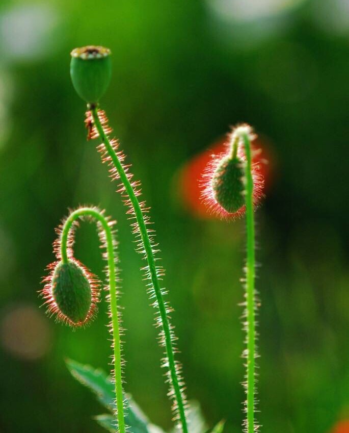 虞美人(学名:Papaver rhoeas L.):一年生草本植物,全体被伸展的刚毛,稀无毛。茎直立,高25-90厘米,具分枝。叶片轮廓披针形或狭卵形,羽状分裂,裂片披针形。花单生于茎和分枝顶端,花蕾长圆状倒卵形,下垂;萼片2,宽椭圆形;花瓣4,圆形、横向宽椭圆形或宽倒卵形,长2.5-4.5厘米,全缘,稀圆齿状或顶端缺刻状,紫红色,基部通常具深紫色斑点。蒴果宽倒卵形,长1-2.2厘米,无毛,具不明显的肋。
