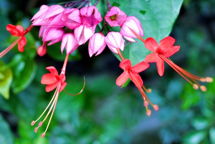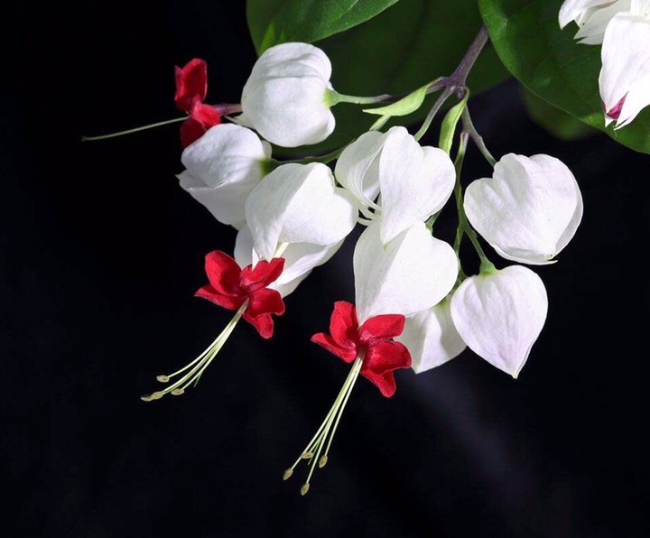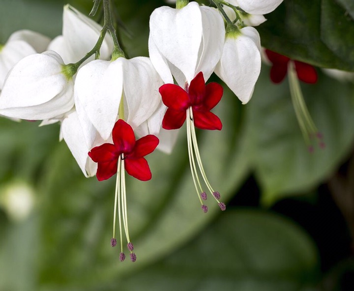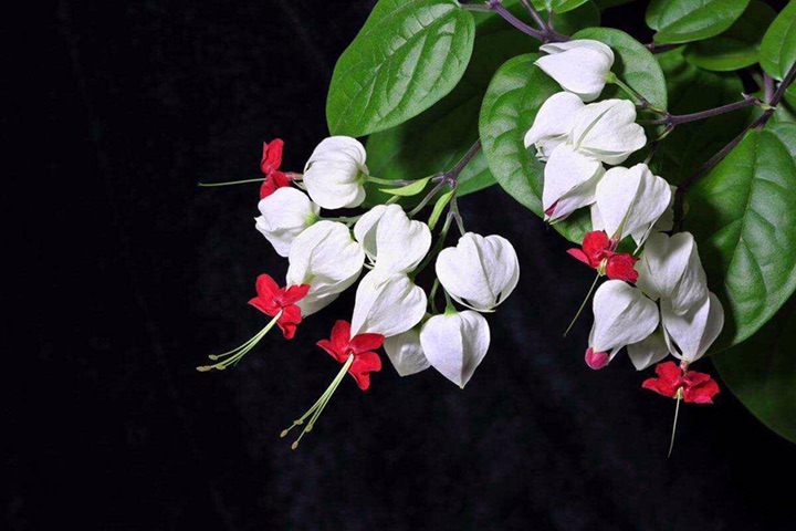 龙吐珠(学名:Clerodendrum thomsonae Balf.):马鞭草科灌木,幼枝四棱形,被黄褐色短绒毛,老时无毛。叶片纸质,狭卵形或卵状长圆形,顶端渐尖,基部近圆形,全缘;聚伞花序腋生或假顶生,二歧分枝;苞片狭披针形;花萼白色,基部合生,中部膨大,裂片三角状卵形,顶端渐尖;花冠深红色,外被细腺毛,裂片椭圆形;雄蕊4,与花柱同伸出花冠外;柱头2浅裂。核果近球形,外果皮光亮,棕黑色;宿存萼不增大,红紫色。花期3-5月。