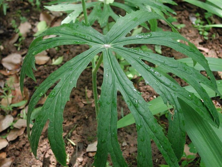 兔儿伞(学名:Syneilesis aconitifolia (Bge.) Maxim.)是菊科兔儿伞属植物。多年生草本。几根状茎短,横走,具多数须根,茎直立,高70-120厘米,具纵肋,不分枝。叶通常2,疏生;叶片盾状圆形,直径20-30厘米,掌状深裂;裂片7-9,每裂片再次2-3浅裂。头状花序多数,在茎端密集成复伞房状,干时宽6-7毫米。瘦果圆柱形,长5-6毫米,无毛,具肋;冠毛污白色或变红色,糙毛状,长8-10毫米。花期6-7月,果期8-10月。