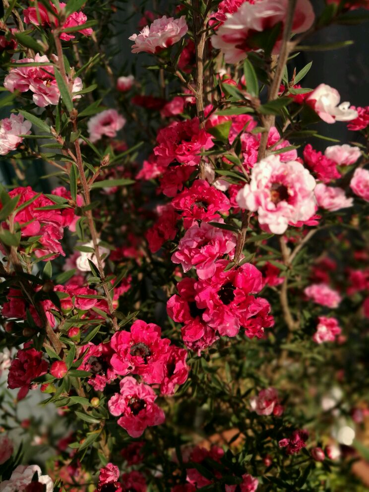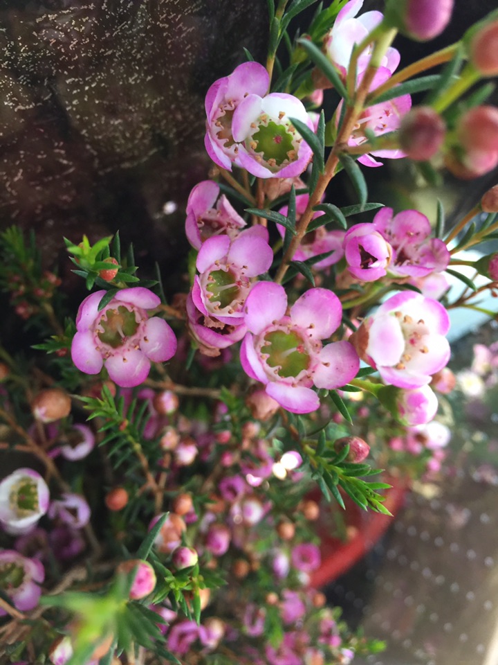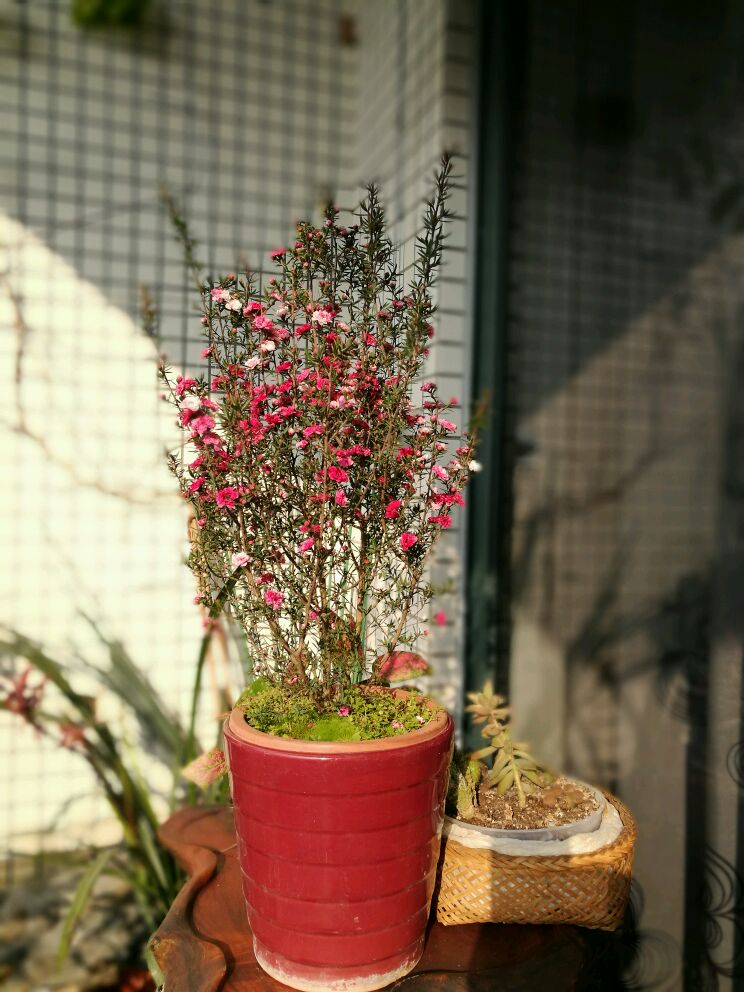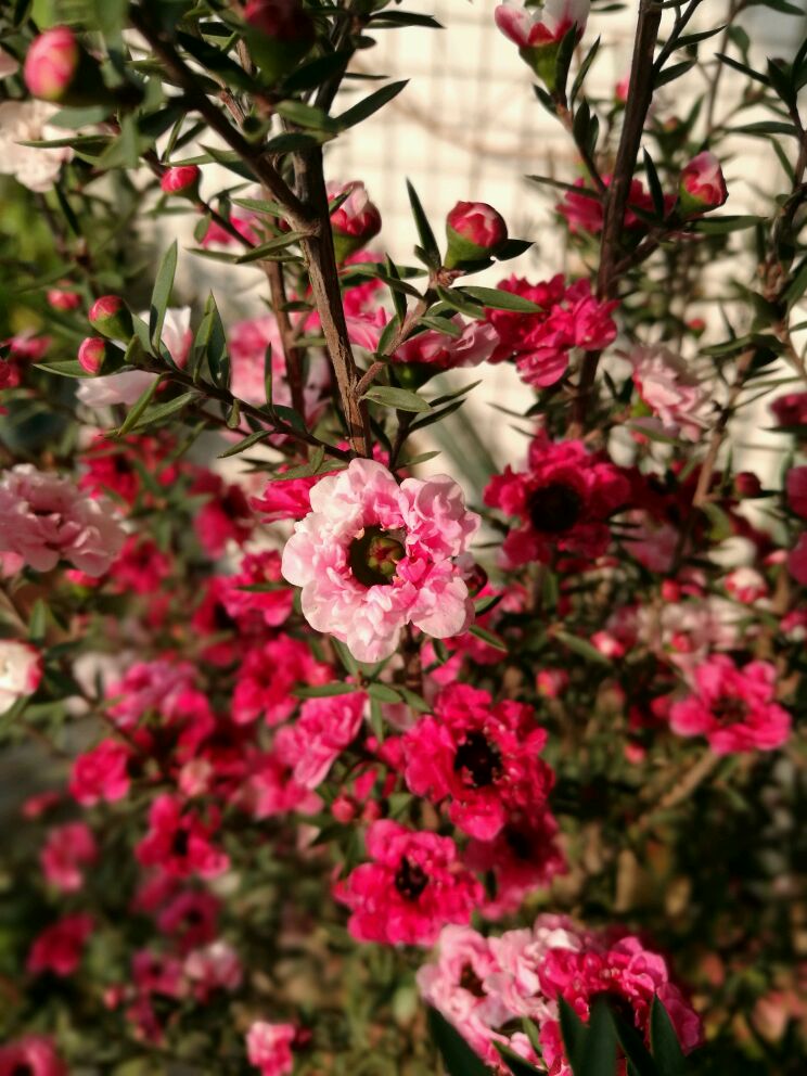 澳梅叶片为对生线形叶,似松针,四季常青。其花似梅花,花瓣蜡质有光泽,花色有白色、粉红色、黄色、蓝色等。