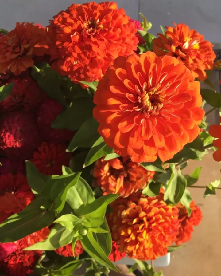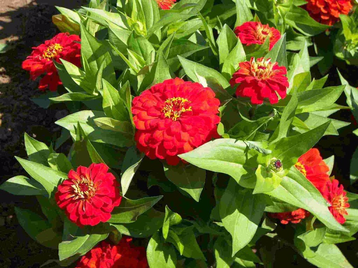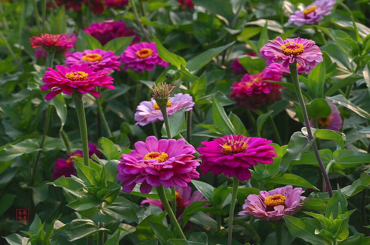 百日菊(学名:Zinnia elegans Jacq.):一年生草本。茎直立,高30-100厘米,被糙毛或长硬毛。叶宽卵圆形或长圆状椭圆形,两面粗糙,下面被密的短糙毛,基出三脉。头状花序单生枝端,总苞宽钟状;总苞片多层,宽卵形或卵状椭圆形。舌状花深红色、玫瑰色、紫堇色或白色,舌片倒卵圆形,先端2-3齿裂或全缘,上面被短毛,下面被长柔毛。管状花黄色或橙色,先端裂片卵状披针形,上面被黄褐色密茸毛。雌花瘦果倒卵圆形,管状花瘦果倒卵状楔形。花期6-9月,果期7-10月。