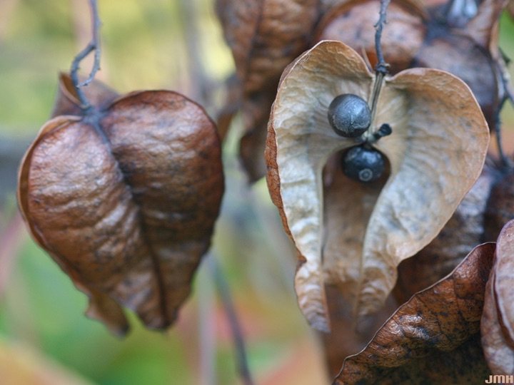 拨开了红色的外衣,可以看见里面两三颗圆滚滚的小黑球,为了满足我的好奇心,我把果子砸开了,看到了饱满的果肉,尝了尝,有点儿苦,含了一会儿,又有点甜,建议嘴巴没味道时吃一颗。(下图为栾树的果实)