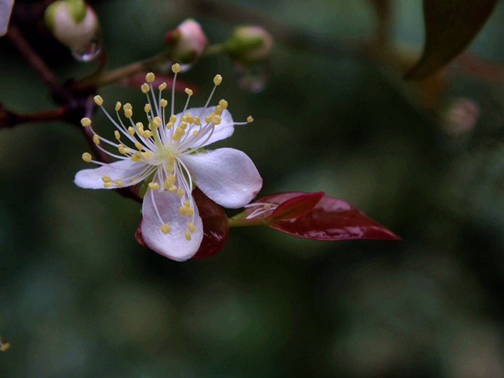 红果仔(学名:Eugenia uniflora Linn.)是桃金娘科,番樱桃属灌木或小乔木,高可达5米,全株无毛。叶片纸质,先端渐尖或短尖,钝头,上面绿色发亮,下面颜色较浅,两面无毛,叶柄极短,花白色,稍芳香,萼片长椭圆形,浆果球形,有种子。春季开花。