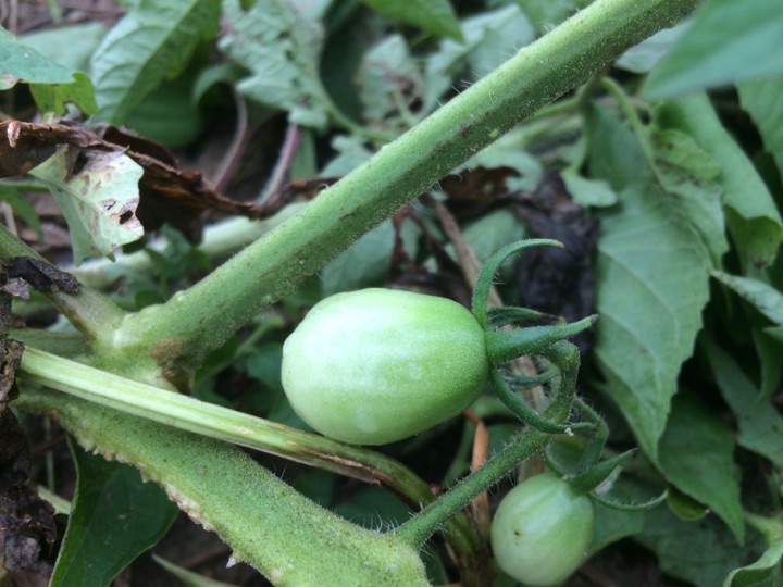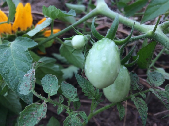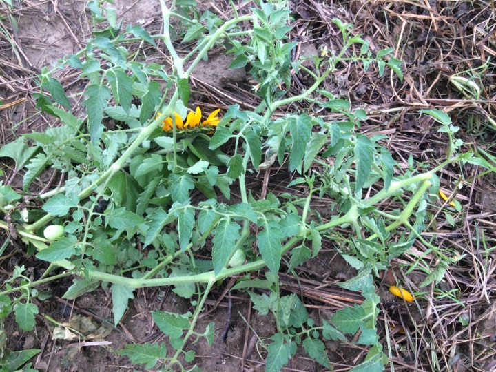 昨天下午的一场暴雨后,西红柿被摧残的直接躺到了地面,有些枝丫还折了。也不知这几个青果还能不能成熟了