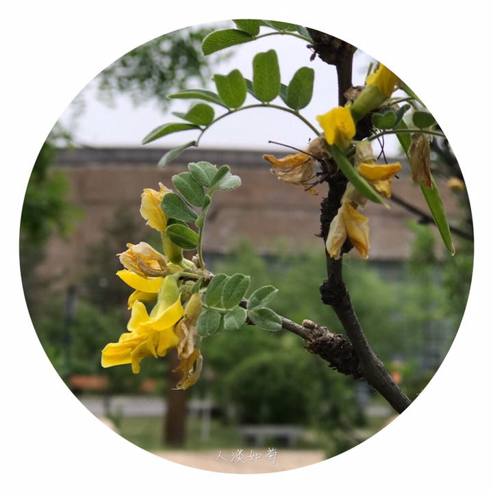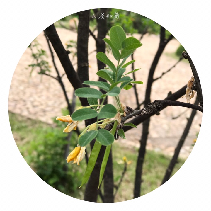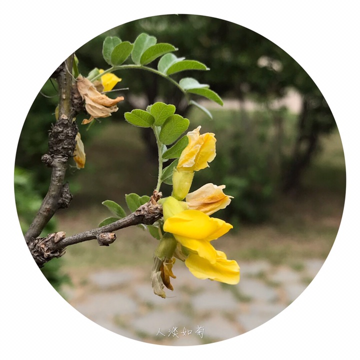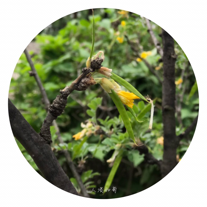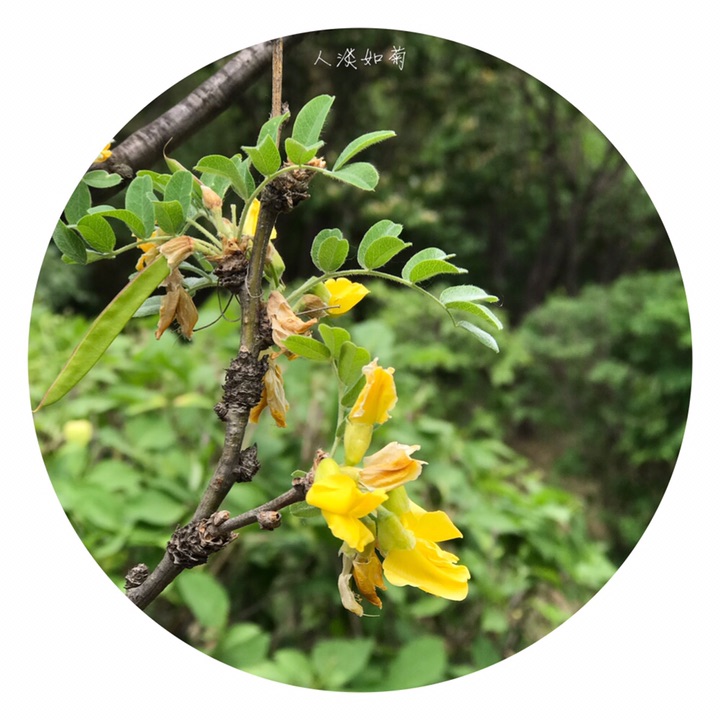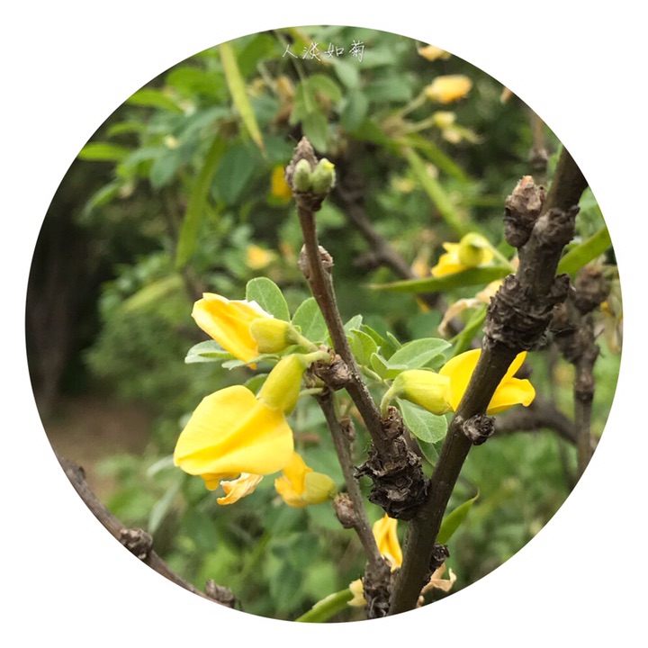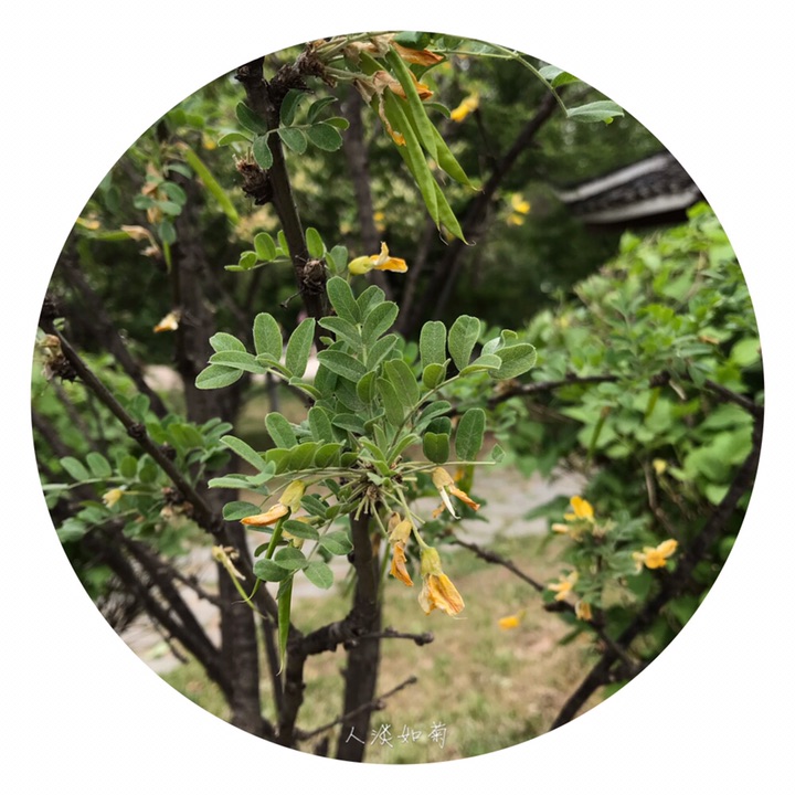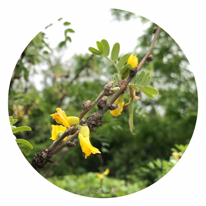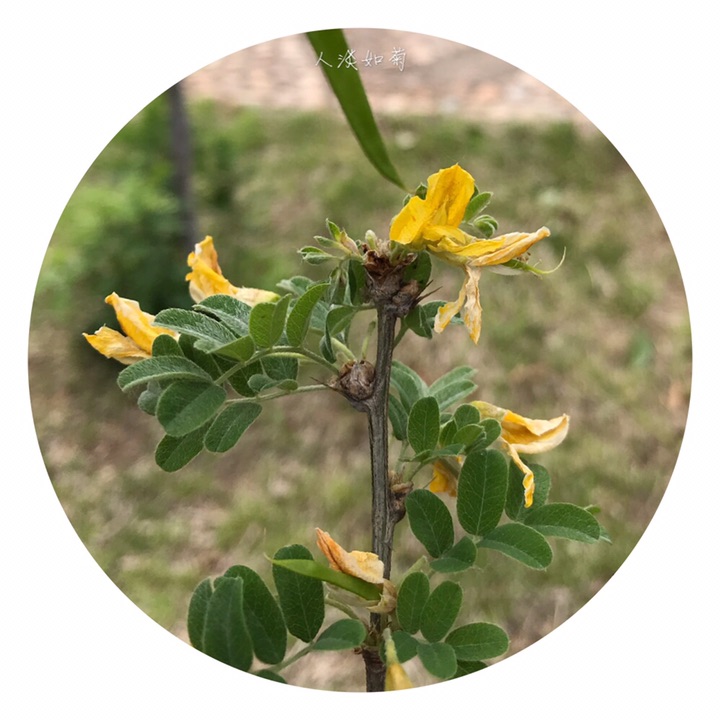 灌木,高1-2米。树皮深褐色;小枝有棱,无毛。托叶三角形,硬化成针刺,长5-7毫米;叶轴脱落或硬化成针刺,针刺长7-15(25)毫米;小叶2对,羽状,有时假掌状,上部1对常较下部的为大,厚革质或硬纸质,倒卵形或长圆状倒卵形,长1-3.5厘米,宽5-15毫米,先端圆形或微缺,具刺尖或无刺尖,基部楔形或宽楔形,上面深绿色,下面淡绿色。花单生,花梗长约1厘米,中部有关节;花萼钟状,长12-14毫米,宽6-9毫米,基部偏斜;花冠黄色,常带红色,长2.8-3厘米,旗瓣狭倒卵形,具短瓣柄,翼瓣稍长于旗瓣,瓣柄与瓣片近等长,耳短小,龙骨瓣宽钝;子房无毛。荚果圆筒状,长3-3.5厘米,宽约5毫米。花期4-5月,果期7月。