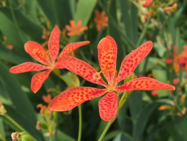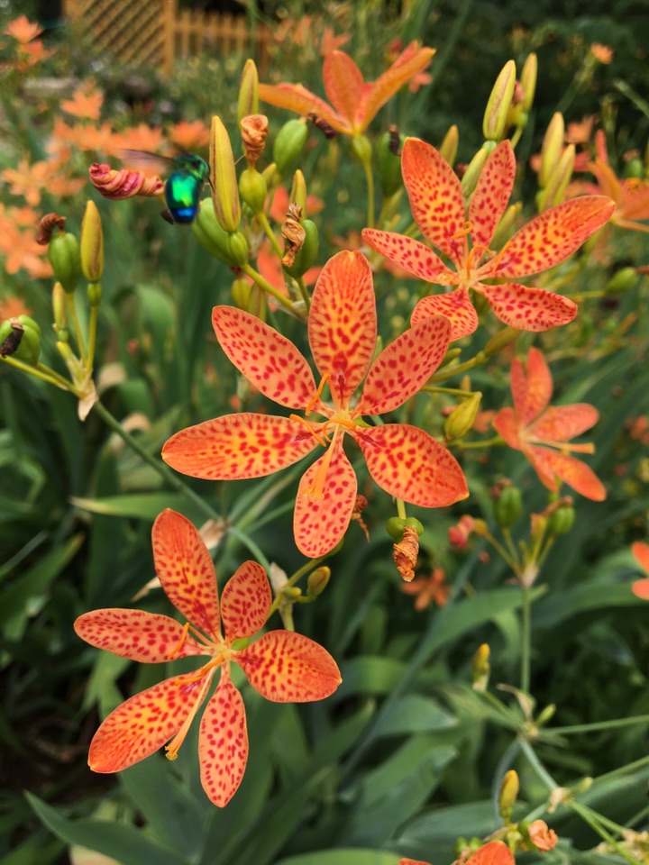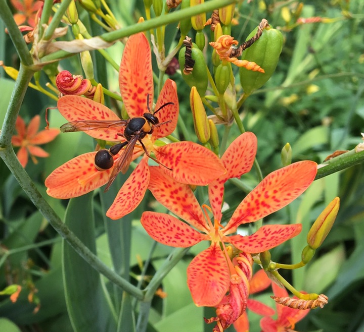 宿根园的射干今年开得特别茂盛,正值花季,蜂蝶纷至,前后飞舞。