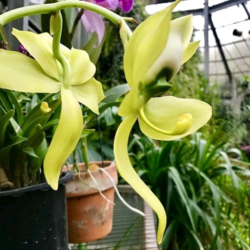 天鹅兰,指出高20~35公分,花朵的花柱长而弯曲,状似天鹅的颈部,因而得名。花朵带有浓香,单性花和两性,是兰花中难得一见的雌雄异株,花色大多在绿色与褐色之间。