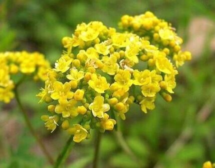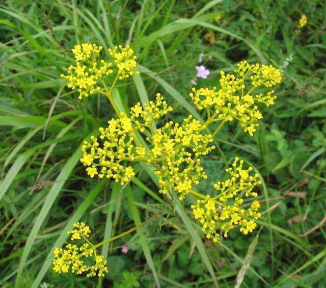 黄花败酱,多年生草本。根茎粗壮,斜生,有多条绳状根。根出叶丛生,有长柄,叶片卵状披针形,先端尖,基部下延。茎生叶对生,叶片通常羽状全裂,顶裂片较大,被针形。复伞房花序顶生,花黄色。瘦果,椭圆形,具三棱,不开裂。花果期7—9月。