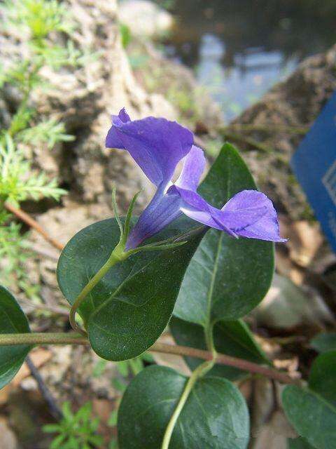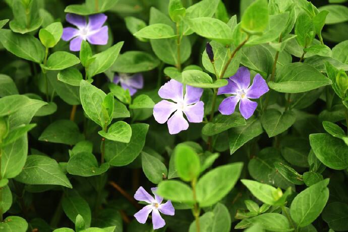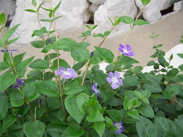 蔓长春花(学名:Vinca major L.):蔓性半灌木,茎偃卧,花茎直立。叶椭圆形,长2-6厘米,宽1.5-4厘米,先端急尖,基部下延;侧脉约4对;叶柄长1厘米。花单朵腋生;花梗长4-5厘米;花冠蓝色,花冠筒漏斗状。蓇葖长约5厘米。花期3-5月。