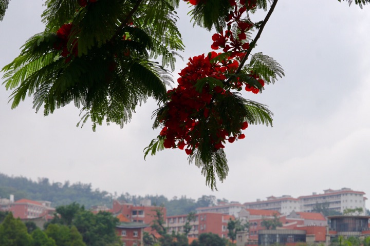 当时的校园以凤凰木,木棉,银桦,白玉兰以及棕榈科植物为观赏树种,校园各处都有荔枝,龙眼,波萝蜜,无花果,黄皮等热带,亚热带果树为主,后来芙蓉湖形成时,又加种了一批芒果树。除绿地,能看到最美的矮灌木就是各色的扶桑,以及含笑,栀子等。春天的含笑散发着浓郁的甜香,五月栀子花开过后就是白玉兰一直开着。突然,在初夏的雨后某一天,凤凰花绽满枝头,又一场夏雨吹着满树艳红,落英缤纷,毕业季到了。看着荔枝红,龙眼熟,就着蝉鸣声声中入夏转秋,开学时又是火一般的凤凰木迎来海内外莘莘学子。当然还有厦门的市花一一三角梅啦,一直到深秋时节。