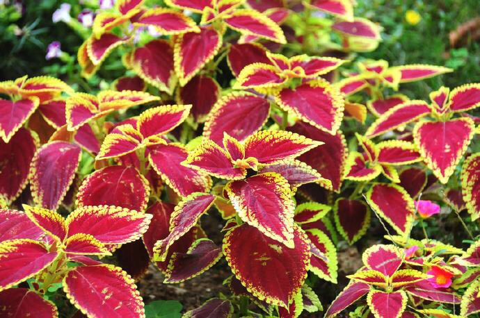 五彩苏(学名:Coleus scutellarioides (L.) Benth.)是唇形科,鞘蕊花属直立或上升草本植物。茎通常紫色,叶片膜质,其大小、形状及色泽变异很大,边缘具圆齿状锯齿或圆齿,色泽多样,有黄、暗红、紫色及绿色,两面被微柔毛,叶柄伸长扁平,轮伞花序多花,花多数密集排列成简单或分枝的圆锥花序;花梗与序轴被微柔毛;苞片宽卵圆形,花萼钟形,萼檐二唇形,花冠浅紫至紫或蓝色,冠筒骤然下弯,冠檐二唇形,花丝在中部以下合生成鞘状。花柱超出雄蕊,花盘前方膨大。小坚果褐色,具光泽,7月开花。