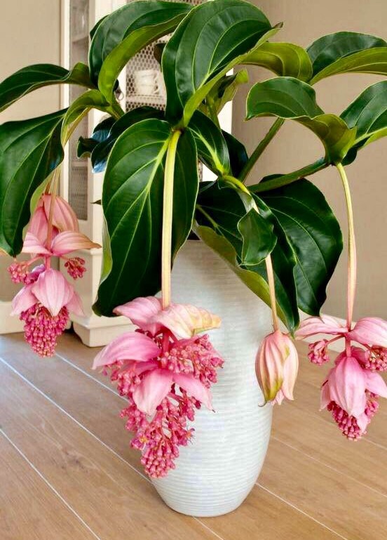 粉苞酸脚杆(学名:Medinilla magnifica Lindl. )是野牡丹科,酸脚杆属常绿小灌木,宝莲灯茎较短而粗壮,叶形类似柑橘,互生。植株多分枝,花茎从叶腋处抽出,硕大的花蕾类似倒挂的灯笼,开花时的花瓣类似倒开的荷花,花茎顶端和花瓣处挂满类似珍珠宝石的小球,故名宝莲灯花。花色有浅粉色和粉红色。花期为2月至8月,花开时间可长达百天以上。