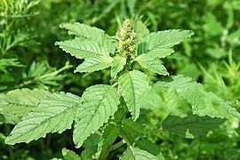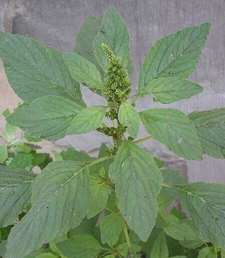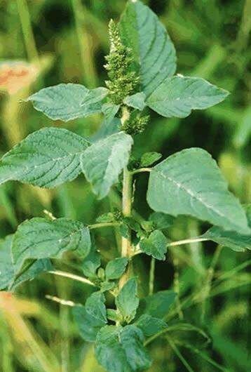 反枝苋(学名:Amaranthus retroflexus L. )是苋科、苋属一年生草本植物,高可达1米多;茎粗壮直立,淡绿色,叶片菱状卵形或椭圆状卵形,顶端锐尖或尖凹,基部楔形,两面及边缘有柔毛,下面毛较密;叶柄淡绿色,有柔毛。圆锥花序顶生及腋生,直立,顶生花穗较侧生者长;苞片及小苞片钻形,白色,花被片矩圆形或矩圆状倒卵形,白色,胞果扁卵形,薄膜质,淡绿色,种子近球形,边缘钝。7-8月开花,8-9月结果。