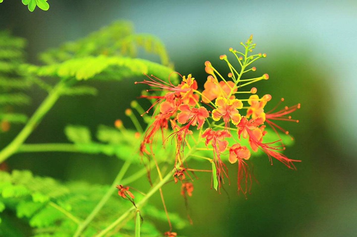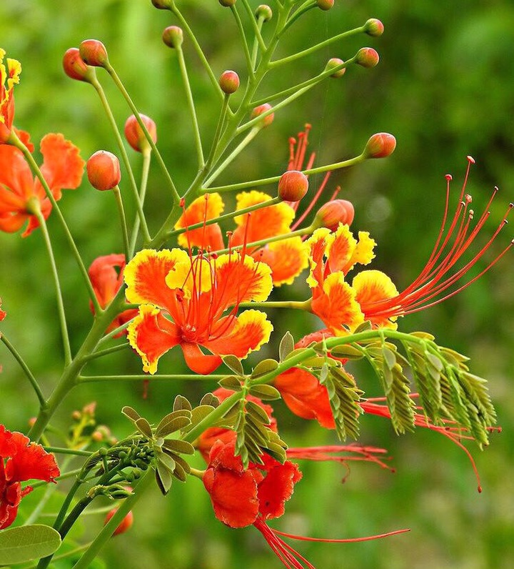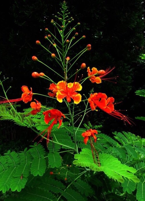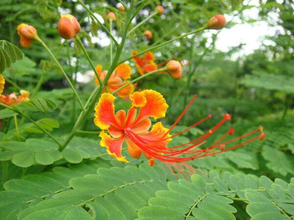 金凤花(学名:Caesalpinia pulcherrima (L.) Sw.):大灌木或小乔木;高达3米,枝绿或粉绿色,有疏刺。二回羽状复叶4对至8对,对生,小叶7对 至ll对,长椭圆形或倒卵形,基部歪斜,顶端凹缺,小叶柄很短。总状花序顶生或腋生,花瓣圆形具柄, 橙或黄色,花梗长达7厘米。荚果黑色。种子6颗至9颗。花果期几乎全年。