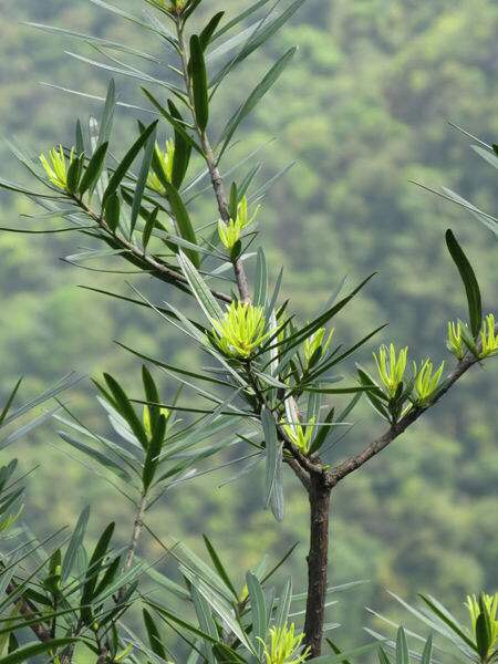 百日青(学名:Podocarpus neriifolius D. Don)是罗汉松科罗汉松属植物。乔木,高达25米,胸径约50厘米;树皮灰褐色,薄纤维质,成片状纵裂;枝条开展或斜展。叶螺旋状着生,披针形,厚革质。雄球花穗状,单生或2-3个簇生,长2.5-5厘米。种子卵圆形。花期5月,种子10-11月成熟。