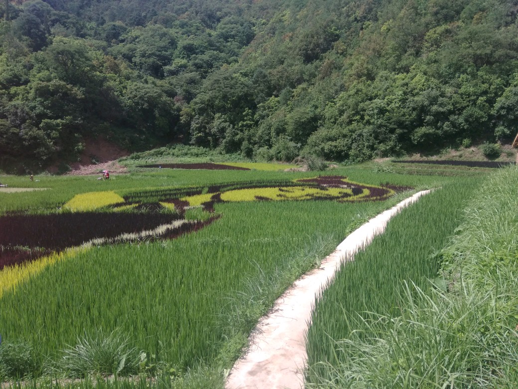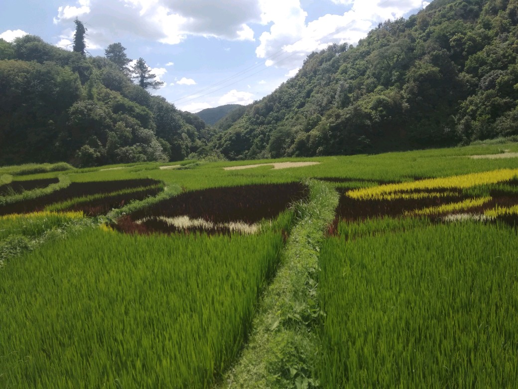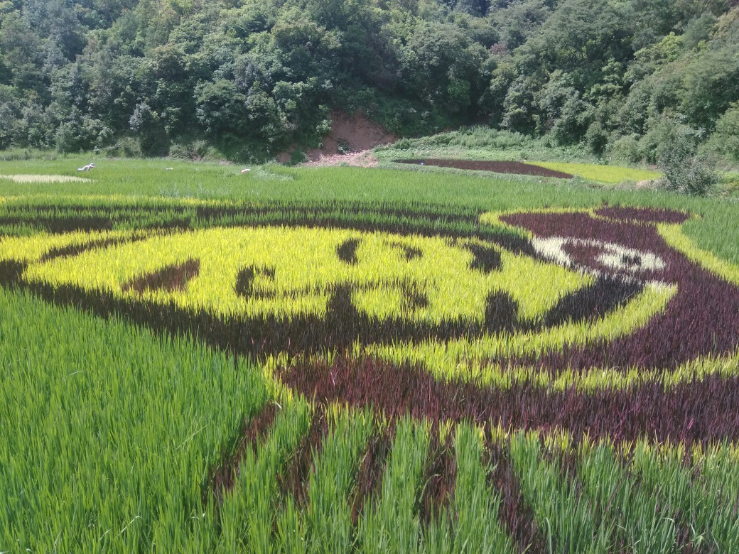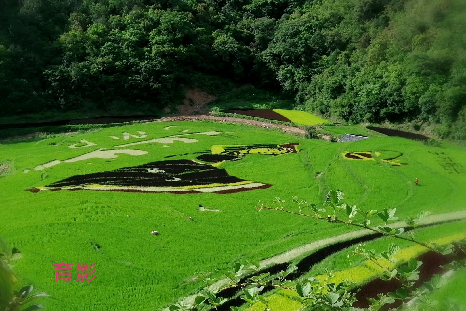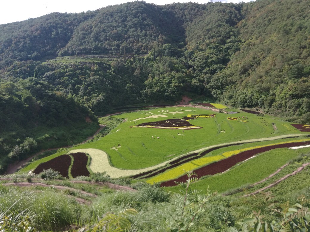 这是云南省昆明市西山区核桃箐的五彩稻田,它坐落于一个山谷之中,一片稻田五彩缤纷,不同颜色的谷子凑成了不同的图案,非常美丽!还有高空观景台,共三个。整个稻田尽收眼底。
