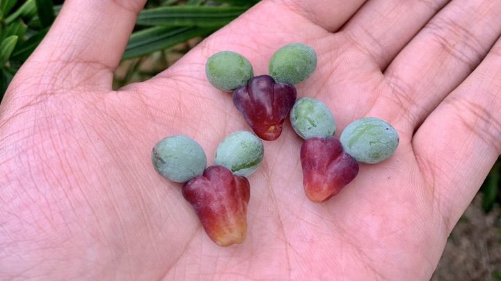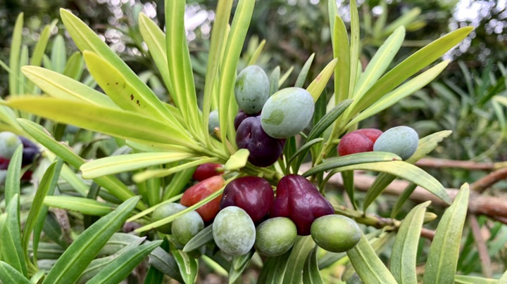 种子披白粉似光头,紫红色种托膨大如袈裟,故得名;紫红色的肉质种托可食用,口感甜糯,营养丰富。