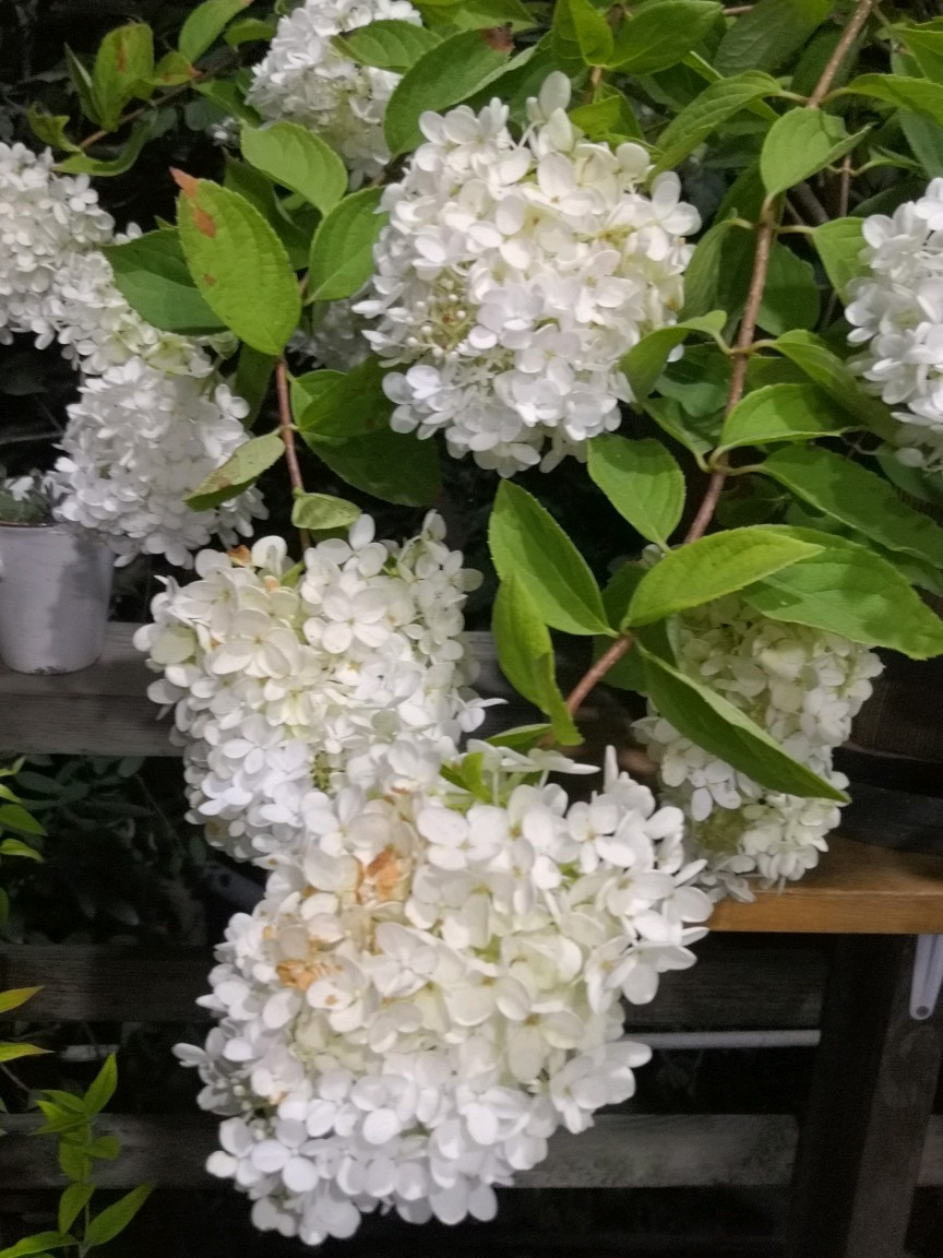 家里的圆锥绣球一直放在太阳底下晒,发现它的叶子和花不同纯度地晒伤了。昨晚把它搬迁到了阳台,让它也享受一下清凉😀