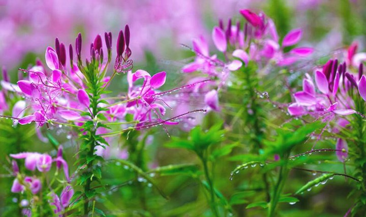 醉蝶花(学名:Cleome spinosa Jacq.):一年生草本植物。花茎直立,株高40厘米-60厘米,有的品种可达1米, 其茎上长有粘汁细毛,会散发一股强烈的特殊气味;叶片为掌状复叶,小叶5枚-7枚,为矩圆状披针形;总状花序顶生,花由底部向上次第开放,花瓣披针形向外反卷,花苞红色,花瓣呈玫瑰红色或白色,雄蕊特长;蒴果圆柱形,种子浅褐色。花期在6月-9月,其花茎长而壮实,花朵盛开时,总状花序形成一个丰满的花球,朵朵小花犹如翩翩起舞的蝴蝶,非常美观。