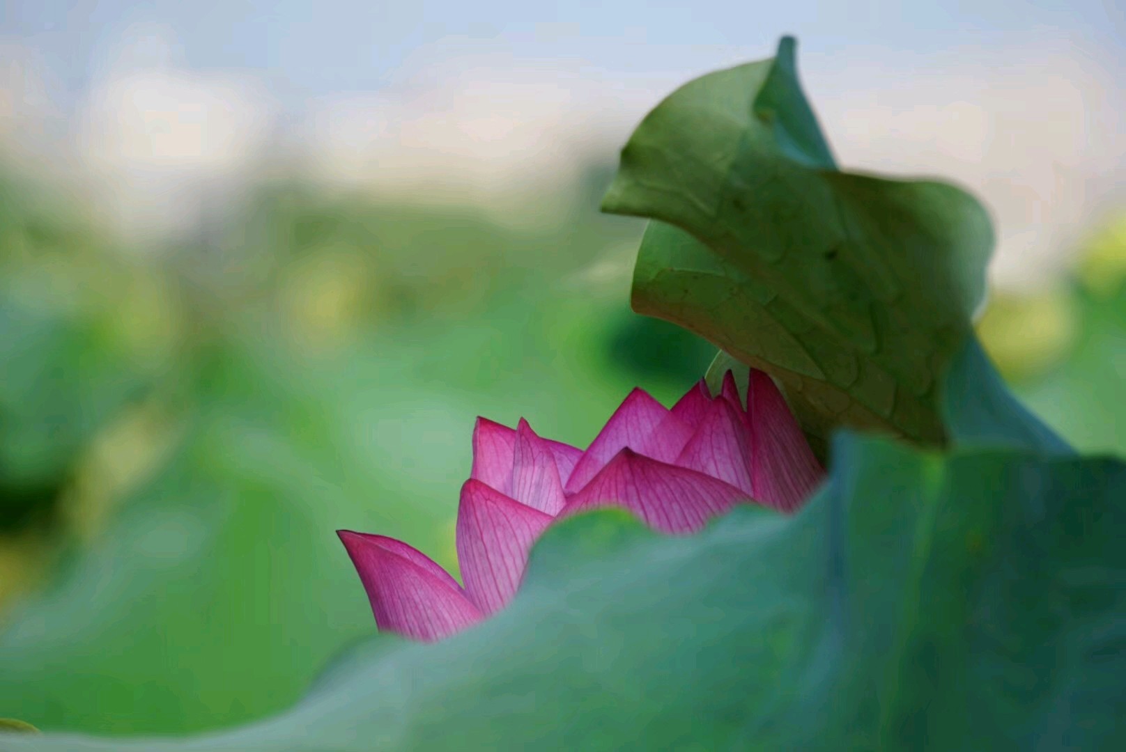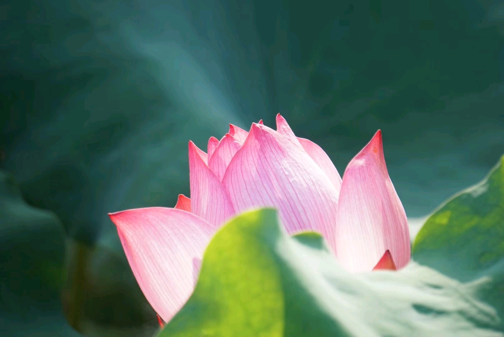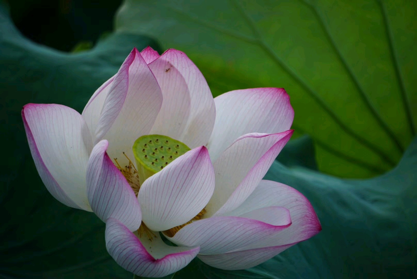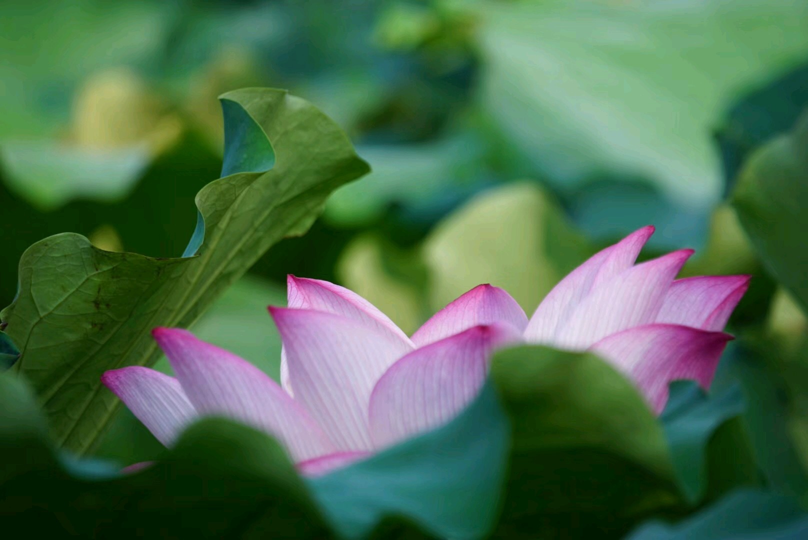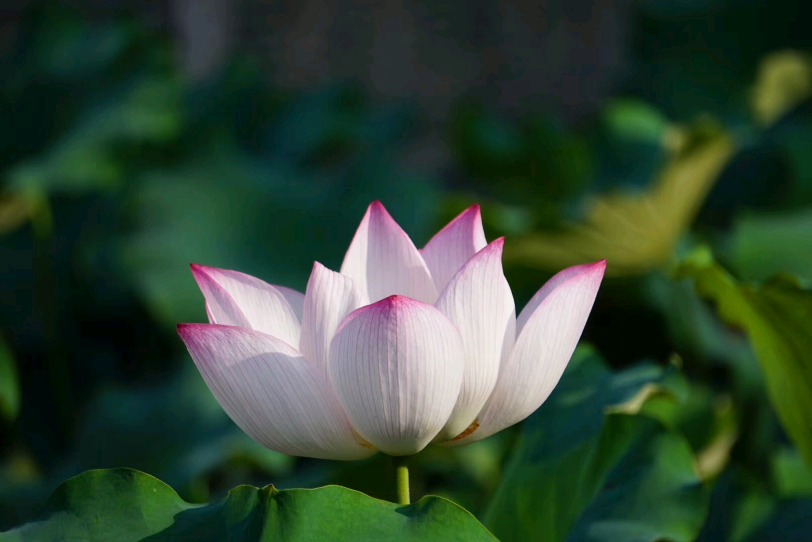 绿色荷叶的衬托,在阳光下你分外惹眼,在偌大的荷塘中,有万绿丛中一点红的美妙,红白相间的花儿笑开了脸,似显得几许妖艳,却又多了几分恬静,展现着你“濯清涟而不妖”的姿态。