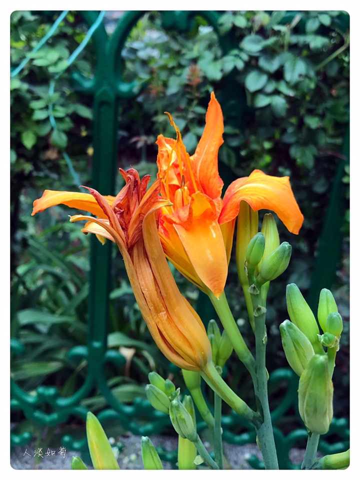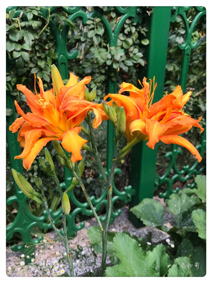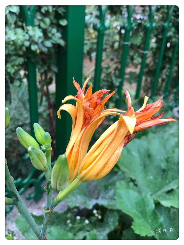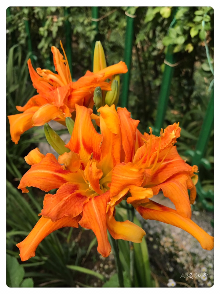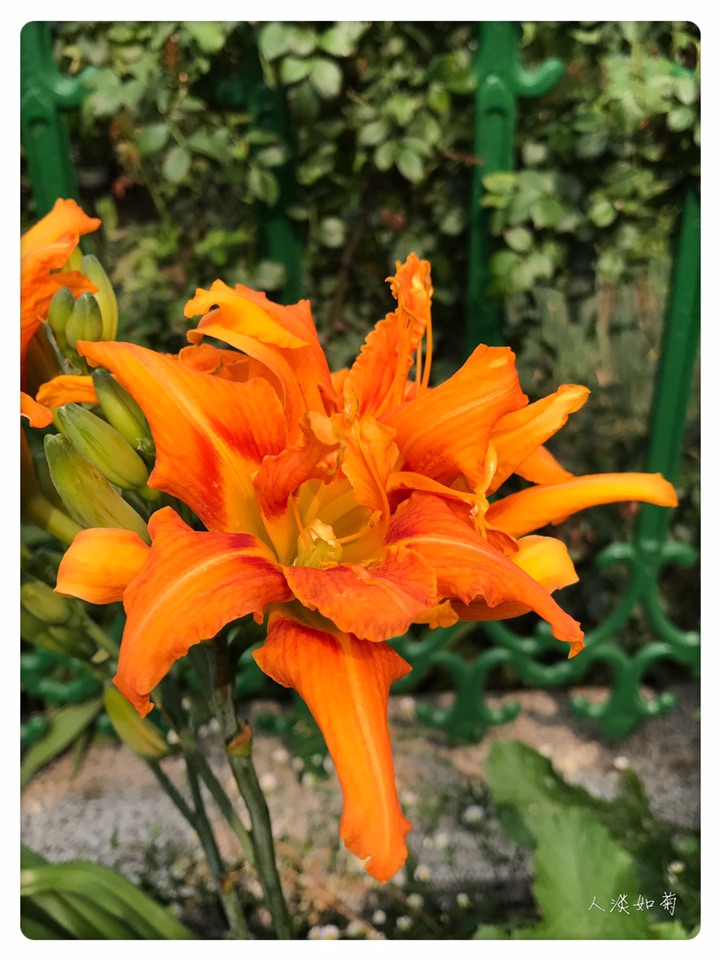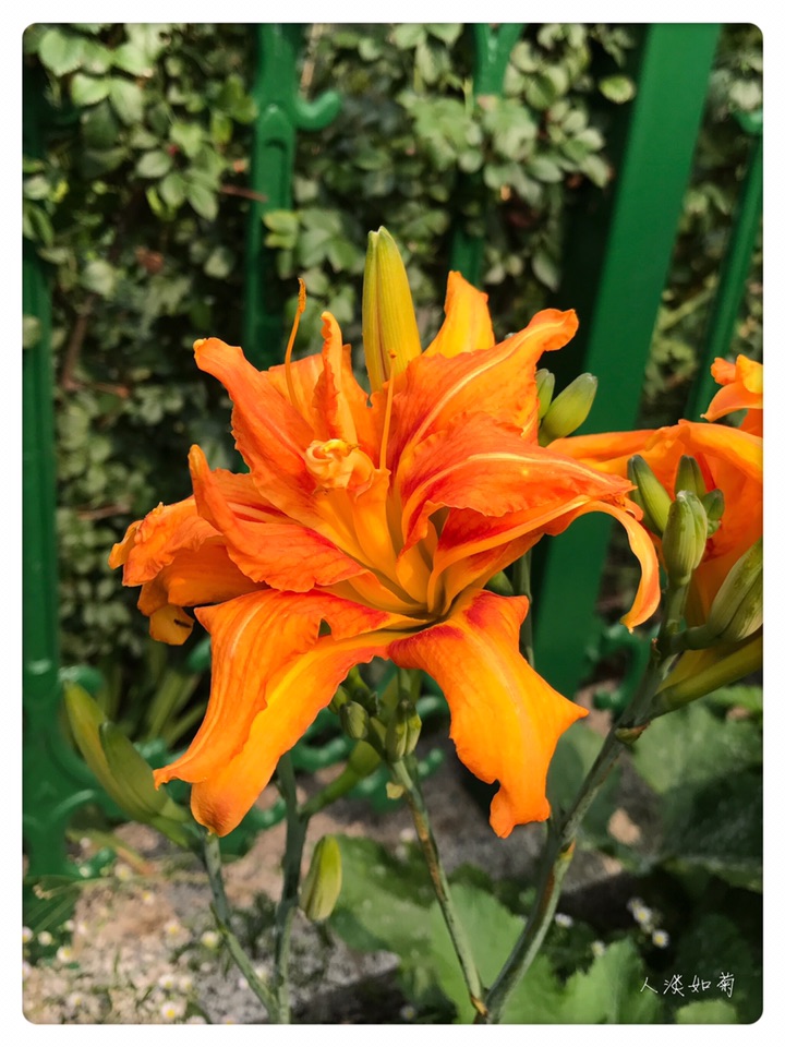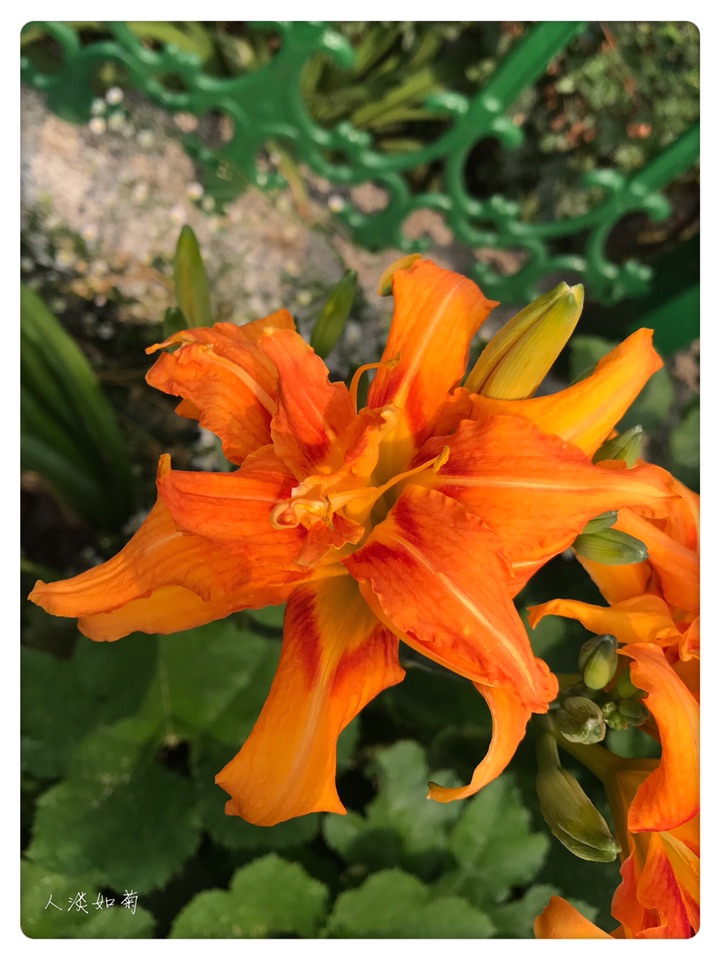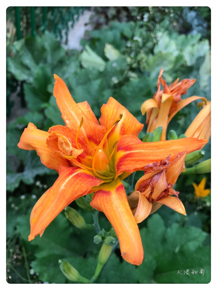 小院的重瓣萱草是初放,第一天开了三朵,桔红色大大的花,与相邻的柠檬萱草呼应着,一个热烈奔放,一个清新淡雅,在绿色的院中吸睛醒目。