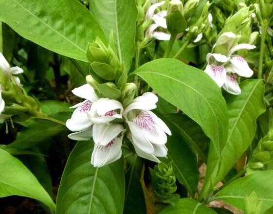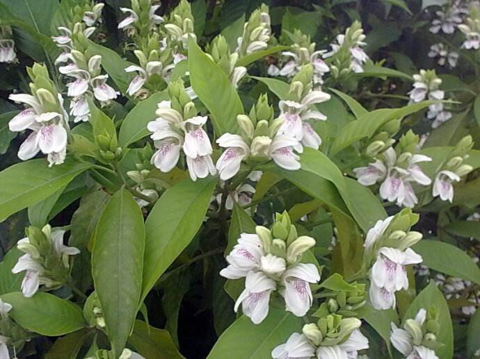 鸭嘴花(学名:Adhatoda vasica Nees)为爵床科鸭嘴花属下的一个种。灌木,株高2-3m,茎节膨大,幼枝有毛,叶对生,矩圆状披针形或矩圆状椭圆形,端尖,全缘,穗状花序顶生或腋生,苞片卵形,花冠唇形,白色,有紫色线条,花期春、夏。