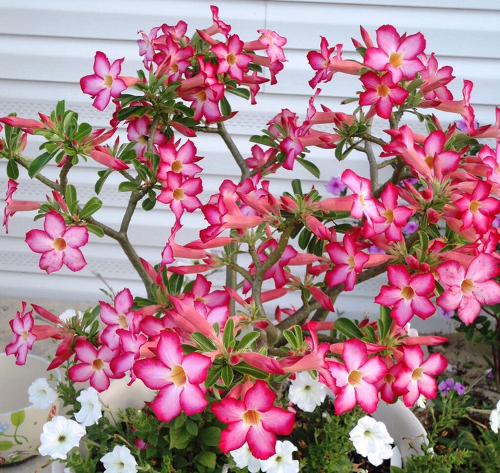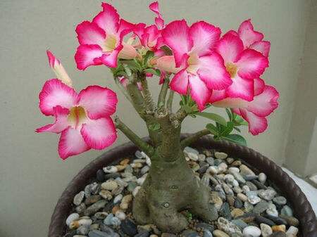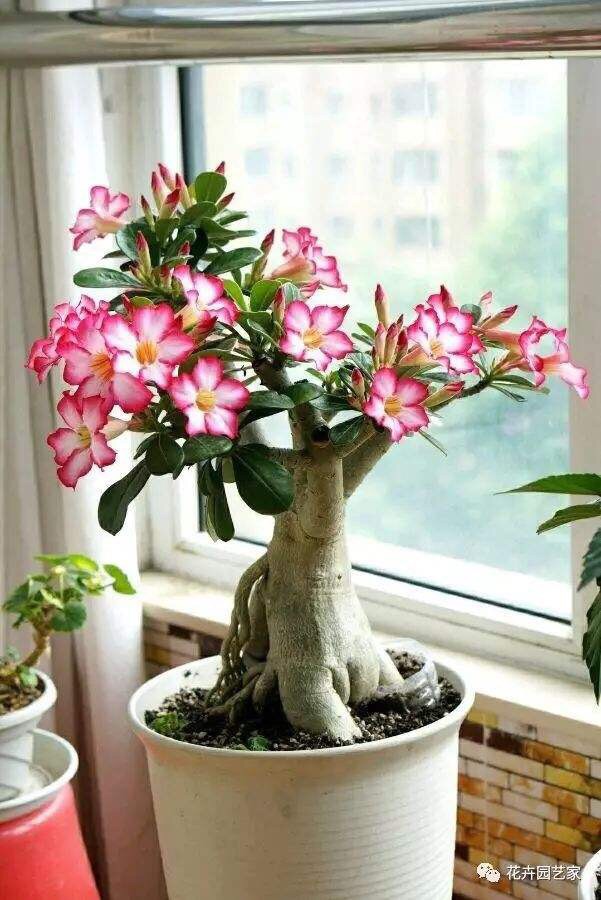 沙漠玫瑰(拉丁学名:Adenium obesum.),其实它并不是生长在沙漠地区的玫瑰,与玫瑰也没什么近缘关系或相像之处。又名:天宝花,夹竹桃科,这是一种夹竹桃科的植物。天宝花属多肉植物,也称多浆植物。多肉灌木或小乔木,高达4.5m;树干肿胀。单叶互生,集生枝端,倒卵形至椭圆形,长达15cm,全缘,先端钝而具短尖,肉质,近无柄。喜高温干燥和阳光充足的环境,耐酷暑,不耐寒,因原产地接近沙漠且红如玫瑰而得名沙漠玫瑰;原产地为非洲的肯尼亚、坦桑尼亚,花盛开时美丽,常栽培观赏。