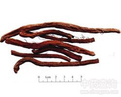 【药材性状】根茎短粗,顶端有时残留茎基。根数条,长圆柱形,略弯曲,有的分枝并具须状细根,长10~20厘米,直径0.3~1厘米。表面棕红色或暗棕红色,粗糙,具纵皱纹。老根外皮疏松,多显紫棕色,常呈鳞片状剥落。质硬而脆,断面疏松,有裂隙或略平整而致密,皮部棕红色,木部灰黄色或紫褐色,导管束黄白色,呈放射状排列。气微,味微苦涩。 栽培品较粗壮,直径0.5~1.5厘米。表面红棕色,具纵皱,外皮紧贴不易剥落。质坚实,断面较平整,略呈角质样。