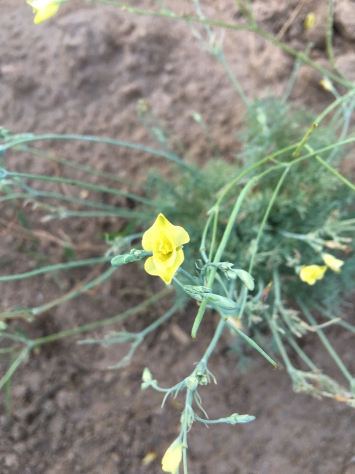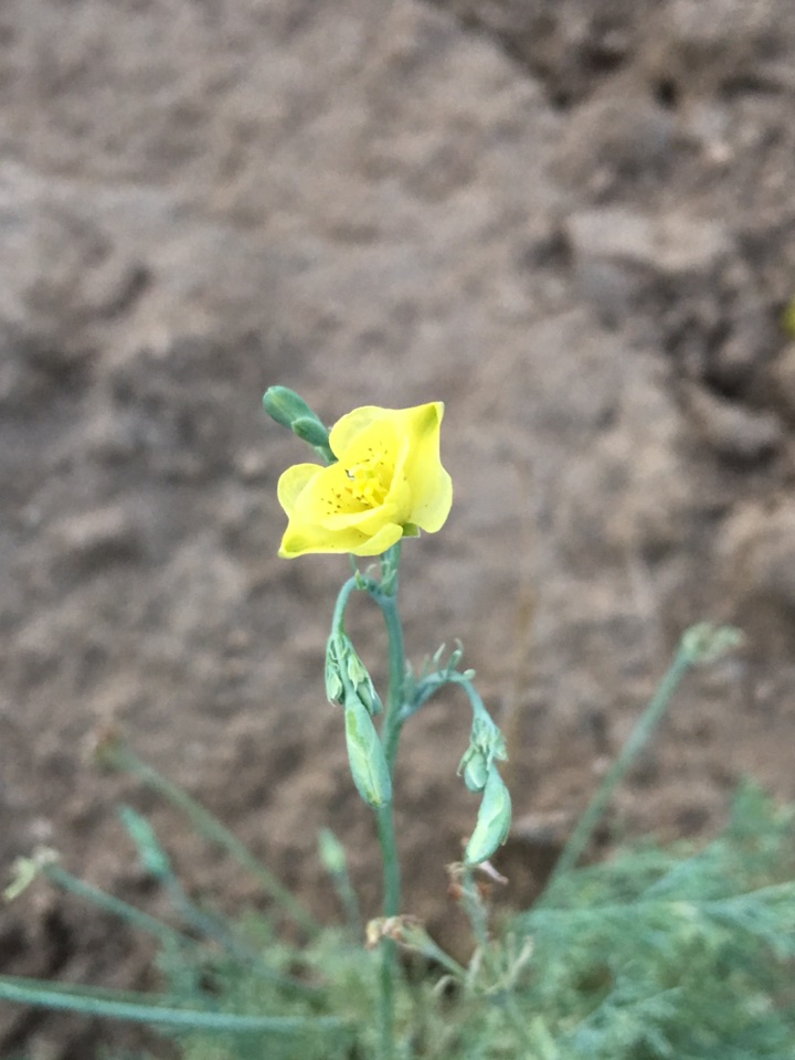 角茴香是紫堇科角茴香属,叶子细碎,花枝也纤细,枝头挑起一朵朵小黄花。仔细看来,那花精巧别致,外层两片花瓣最大,呈❤️形,对生;中间的花瓣呈筒形,边缘外翻,配上里面的丝状花蕊,像一只倒挂的风铃。它全草入药,能清热泻火、镇咳等。