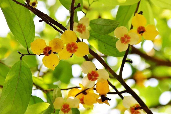 银钩花(学名:Mitrephora thorelii Pierre)是番荔枝科银钩花属植物,乔木,高达25米,胸径达50厘米;树皮灰黑色至深灰黑色,韧皮部淡赭色,略有香甜气味。叶近革质,卵形或长圆状椭圆形,长达15厘米,宽7-10.5厘米,顶端短渐尖,基部圆形,叶面除中脉外无毛,有光泽。花淡黄色,直径1-1.5厘米,单生或数朵组成总状花序,腋生或与叶对生。果卵状或近圆球状,成熟时有环纹;果柄细长,密被褐色绒毛。花期3-4月,果期5-8月。