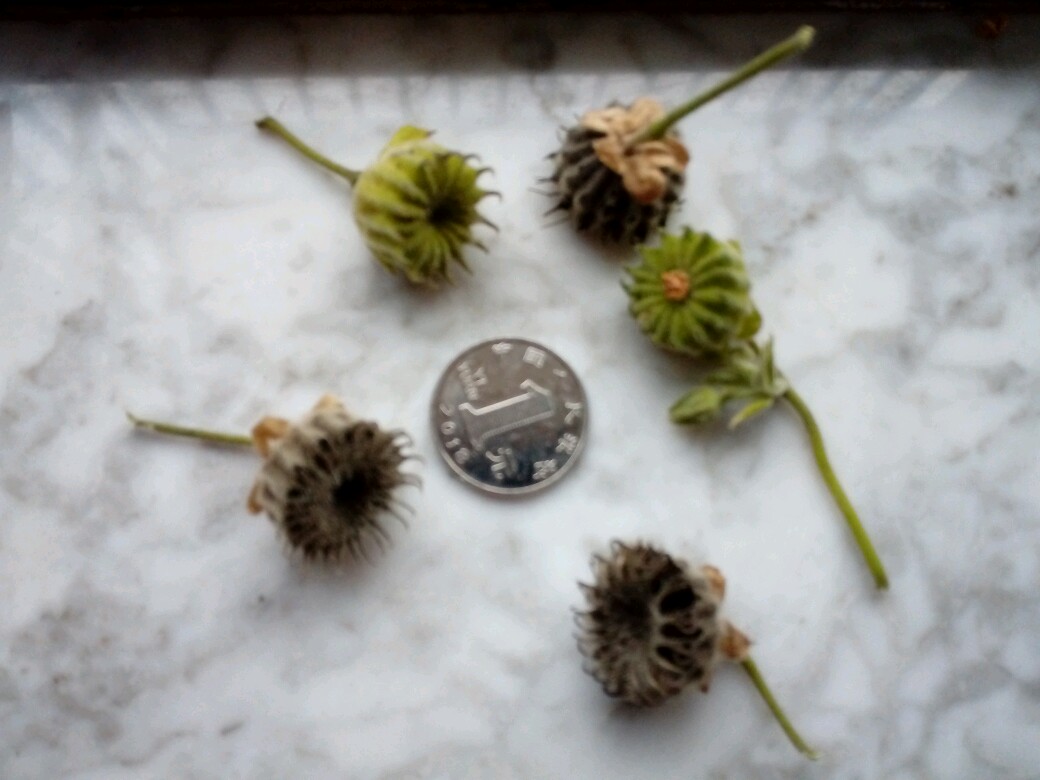 《本草纲目》:苘麻,今之白麻也,多生卑湿处,人亦种之。叶大如桐叶,团而有尖,六、七月开黄花,结实如半磨形,有齿,嫩青,老黑,中子扁黑,状如黄葵子,其茎轻虚洁白,北人取皮作麻。其嫩子。小儿亦食之。
