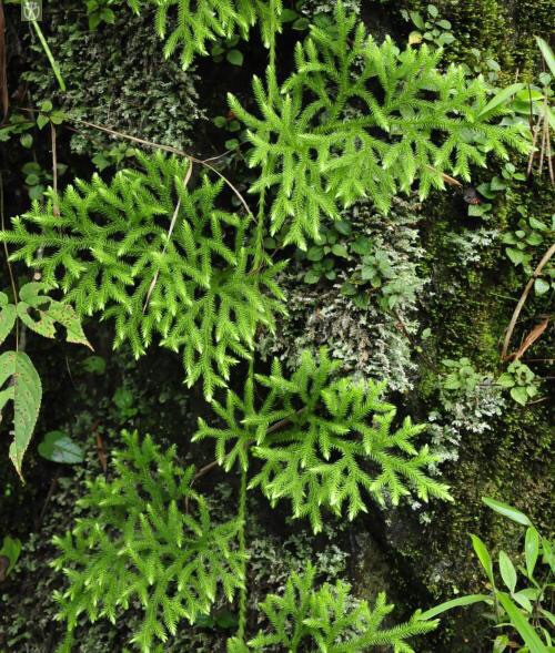 石松(学名:Lycopodium japonicum Thunb. ex Murray)是石松科,石松属多年生土生植物。匍匐茎地上生,细长横走,侧枝直立,高可达40厘米,多回二叉分枝,稀疏,叶螺旋状排列,密集,上斜,披针形或线状披针形,草质,孢子囊穗集生于总柄,总柄上苞片螺旋状稀疏着生,薄草质,形如叶片;孢子囊穗不等位着生,直立,圆柱形,孢子叶阔卵形,先端急尖,具芒状长尖头,边缘膜质,啮蚀状,纸质;孢子囊生于孢子叶腋,略外露,圆肾形,黄色。