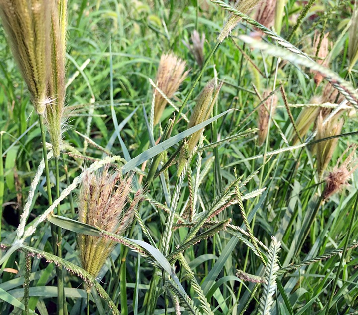 3.虎尾草。又称棒槌草大屁股草。为禾本科虎尾草属一年生草本植物。穗状花序有5到10束左右。看起来更像扫帚或者刷子。 手机拍的没对好焦◑▂◐