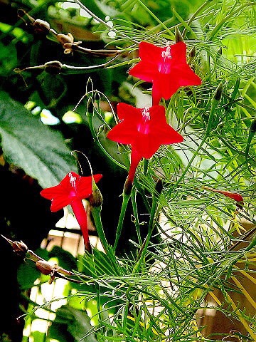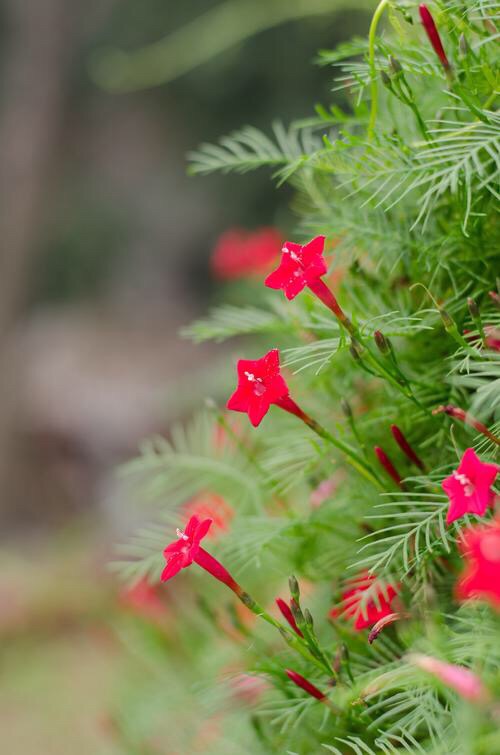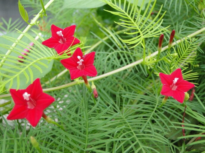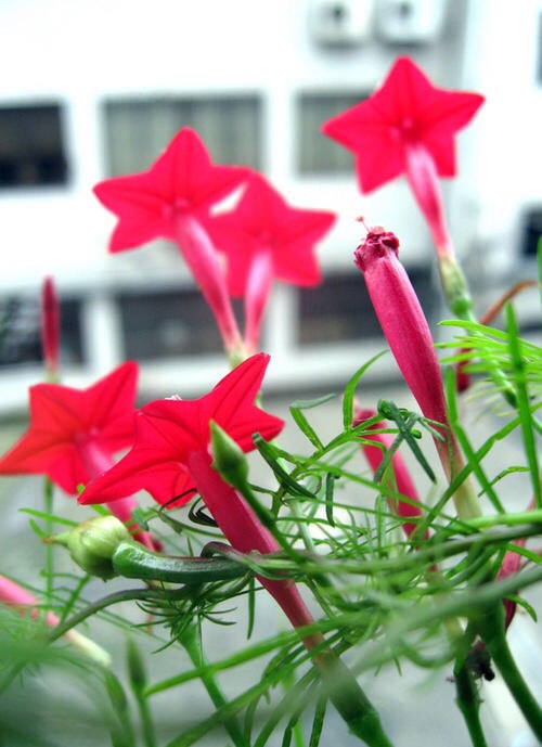茑萝花,原名:茑萝松, 别名:羽叶茑萝茑萝松、新娘花。属旋花科、茑萝属植物,一年生柔弱缠绕草本。