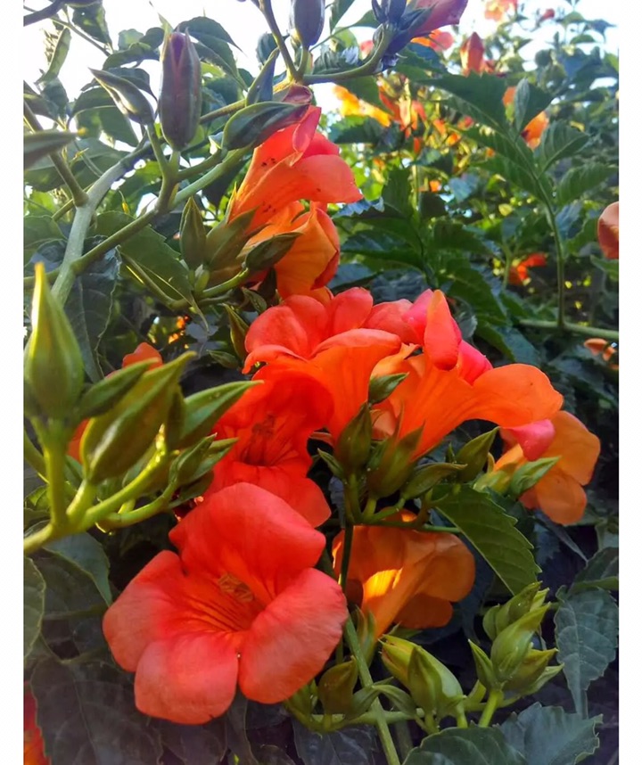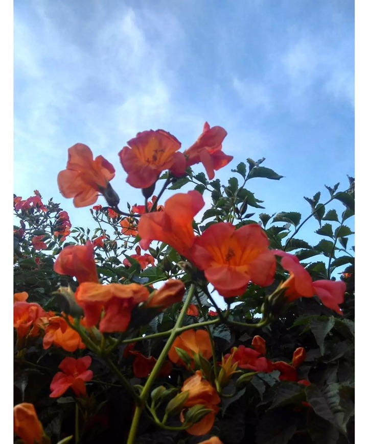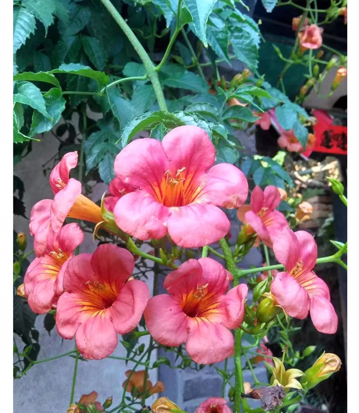 好吧,我眼皮子浅,目前还从未看到过可以独立的凌霄花,但总觉得从植物的角度说来不科学,凌霄乃是藤本,必须借助气根攀附于支撑物上生长,不然只能说空中楼阁,又或者先攀附到一定程度,茎条木质化之后再挺直腰杆除去支撑……你看,书年多了人就变得不那么浪漫了。念在大千世界无奇不有的份上,还是宁可信其有吧!花儿得了凌霄这样的名字,古往今来有多少人会觉得不爽,于是吟诗作赋要吐槽一下,好在凌霄花的模样还不错,所以也不至于招人烦,反而那些心存宏图远志的人,喜欢在身边种个一二株,寒窗苦读,也觉得有个精神寄托伴侣依靠,当然如今再也没有人这样做了……