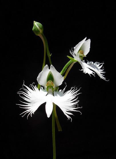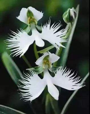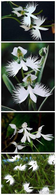 狭叶白蝶兰(学名:Pecteilis radiata (Thunb.) Rafin.):植株高18-35厘米。块茎椭圆形或近球形,肉质。茎细长,直立,基部具3-5枚叶。叶片线形,长5-10厘米,宽3-6毫米,向上伸展,先端渐尖,基部成抱茎的鞘。总状花序具1-2朵花;花较小,直径约1.5-3厘米,白色;萼片淡绿色,狭卵形;花瓣白色,斜卵形,直立,长10-12毫米,先端近急尖,外侧边缘具齿或浅的流苏,与中萼片靠合呈兜状;唇瓣白色,短楔形,长约巧毫米,3深裂。花期7-8月。