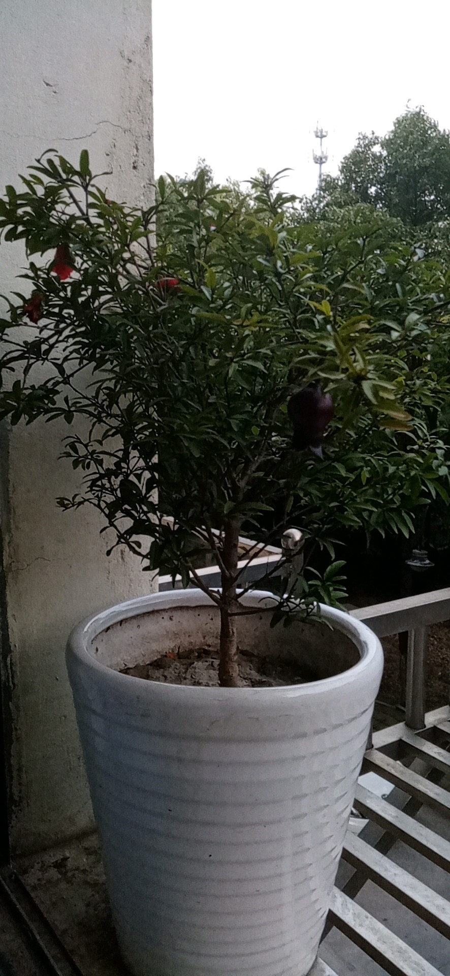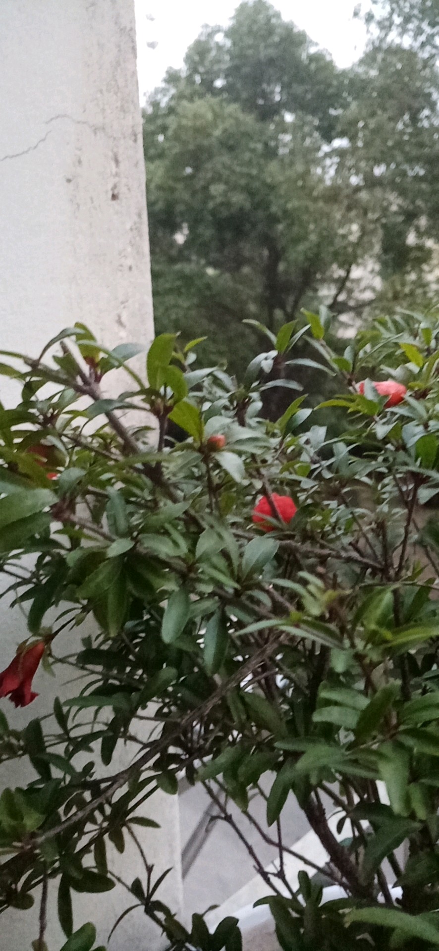 春天,满树枝的石榴花。夏天,天气炎热,花掉了不少。修剪一下,再给它施一些肥。现在,天气凉爽,又开了几朵。